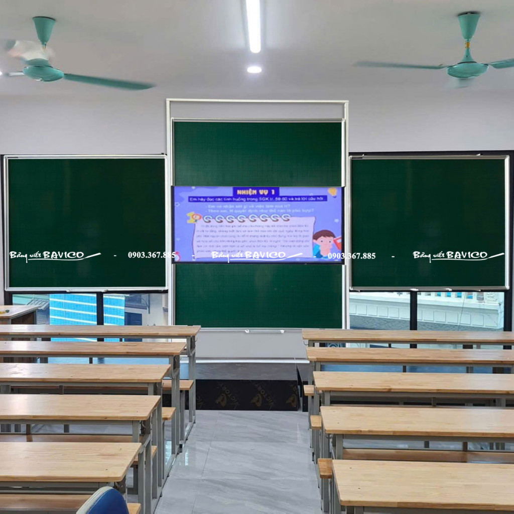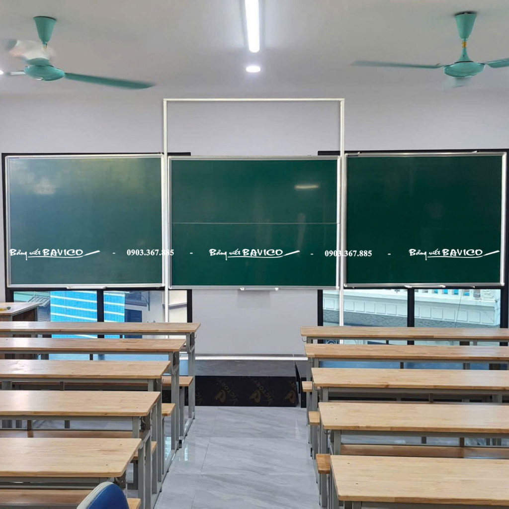 Đây là loại bảng trượt dọc dạng nguyên khối, thiết kế theo chiều dọc, giúp các mặt bảng có thể trượt lên – xuống linh hoạt. Trung tâm bảng được thiết kế để lắp đặt TV hoặc bảng tương tác thông minh, trong khi hai bên là mặt bảng từ Hàn Quốc chuyên dùng viết phấn hoặc viết bút lông, tùy theo yêu cầu.