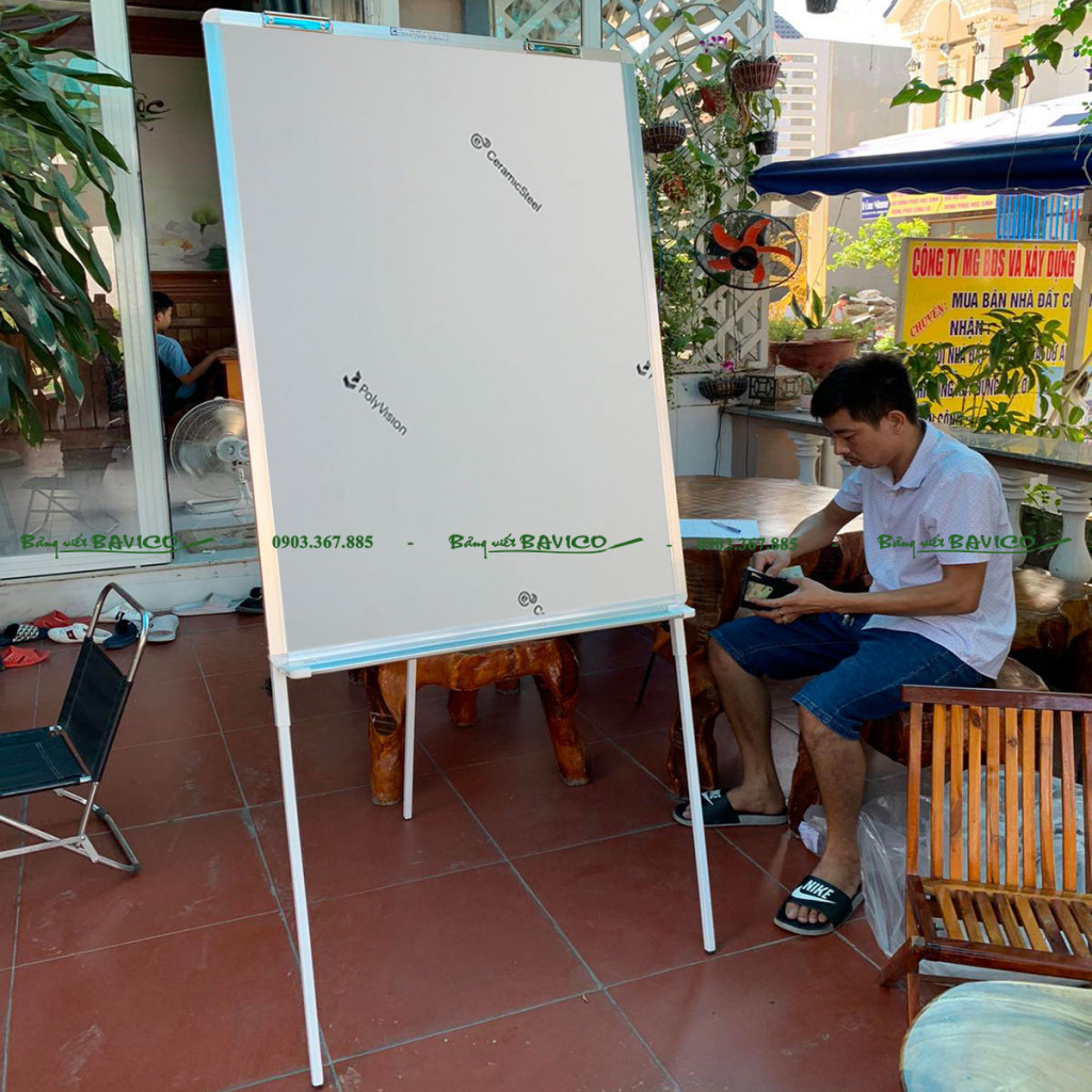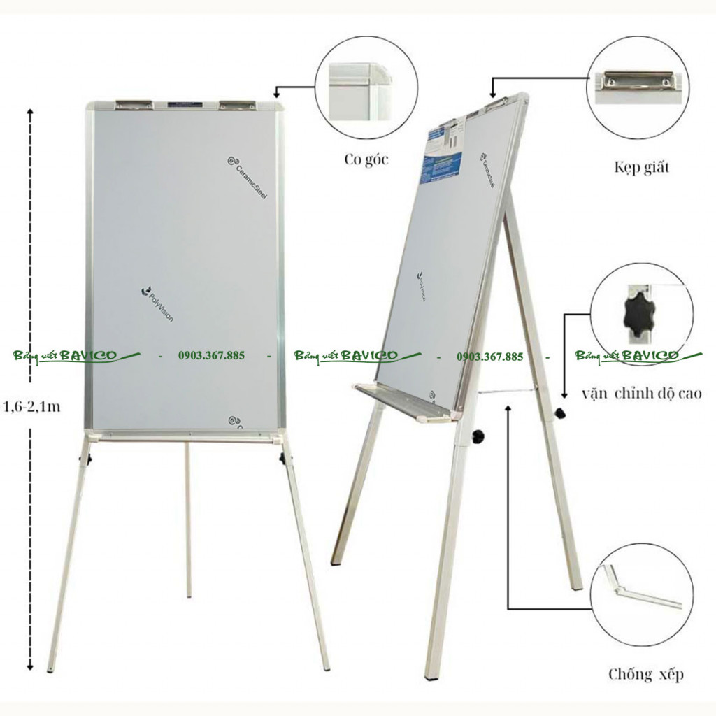 Đây là loại bảng trắng viết bút lông, có khả năng hít nam châm, được gắn trên chân đẩy di động có bánh xe và tích hợp thanh kẹp giấy flipchart tiện lợi. Mặt bảng được làm từ thép phủ sứ ceramic của Bỉ, chống trầy xước, chịu lực tốt và có độ bền lên tới hàng chục năm.