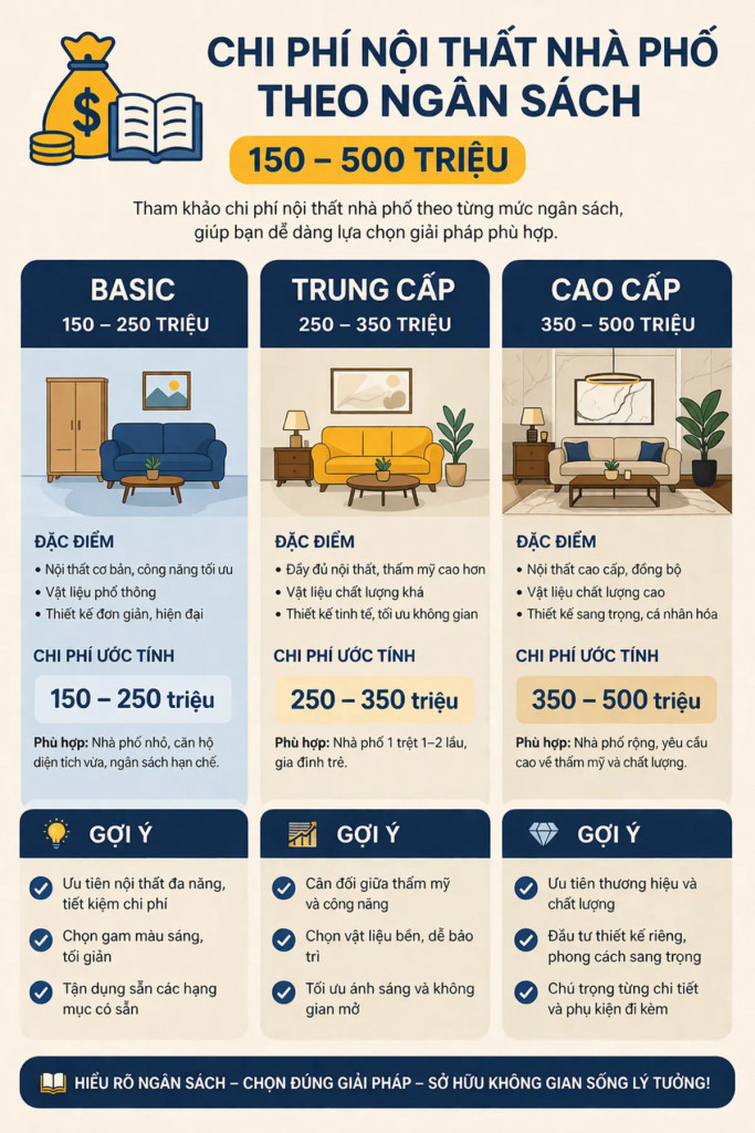 👉 Thực tế, chi phí nội thất nhà phố năm 2026 thường dao động 150 – 500 triệu, tùy vào: