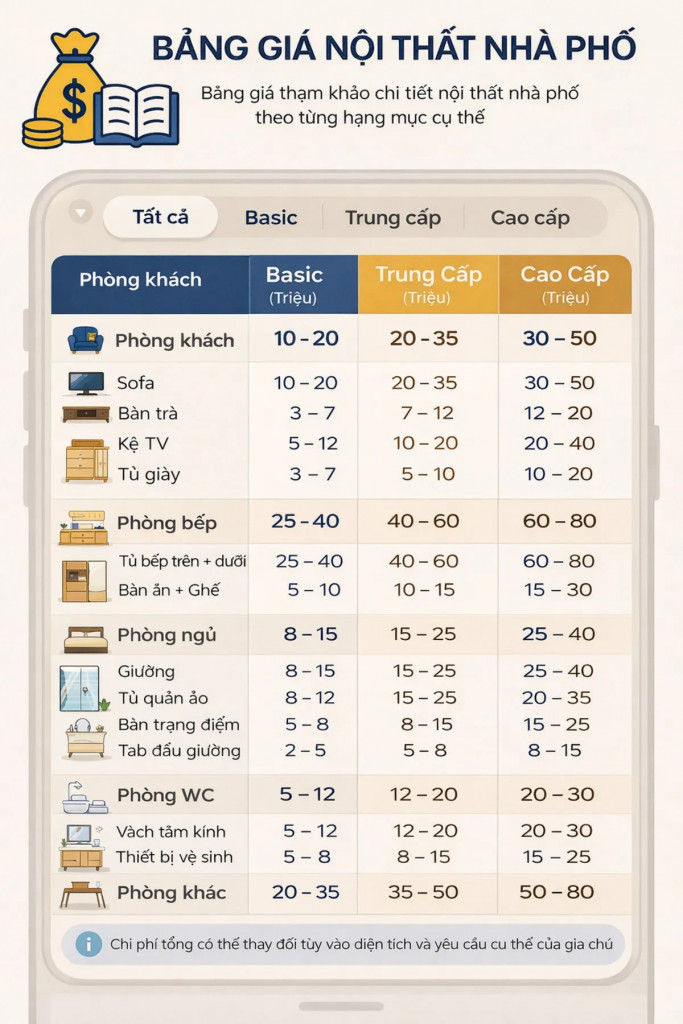 📊 Bài viết chia sẻ bảng giá nội thất nhà phố 2026 chi tiết cùng kinh nghiệm dự toán thực tế trước khi bắt đầu làm nội thất.