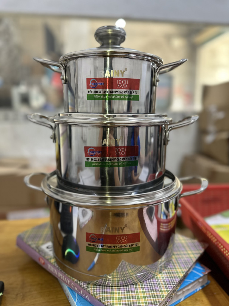 Bộ 3 Nồi 1 Đáy Rainy với 3 kích thước khác nhau sẽ giúp bạn trở thành người nội trợ đảm đang, tạo ra những món ăn ngon cho gia đình. Sản phẩm được làm từ chất liệu Inox nhập khẩu từ Đức có nắp đậy kín, giúp giữ hơi nóng tốt và hương vị thực phẩm lâu dài, chống trào thực phẩm khi nấu. Không bị oxy hoá và dễ dàng chùi rửa, giữ được độ sáng bóng trong thời gian dài, đồng thời không ra ten, không làm ảnh hưởng đến chất lượng thực phẩm.