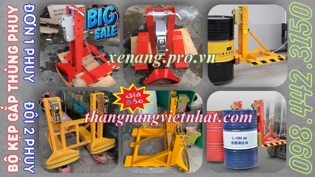 *. Bộ kẹp phuy đơn - Bộ kẹp phuy đôi hoạt động hoàn toàn tự động được móc vào 2 càng xe nâng động cơ và kẹp thùng phuy lên cao, có thể kẹp được cả phuy nhựa nếu gia cố được chắc chắn. Sử dụng dể dàng di chuyển linh hoạt cho quá trình nâng, hạ và xếp dỡ hàng hóa.