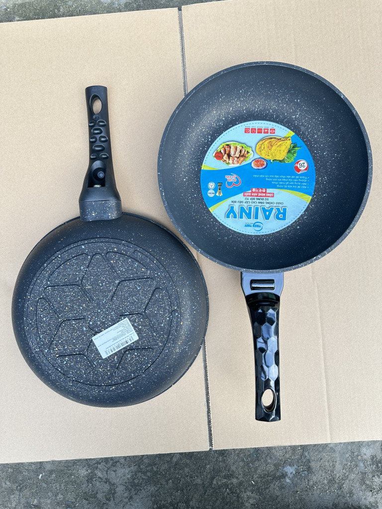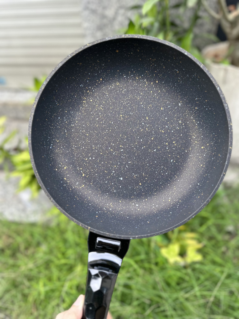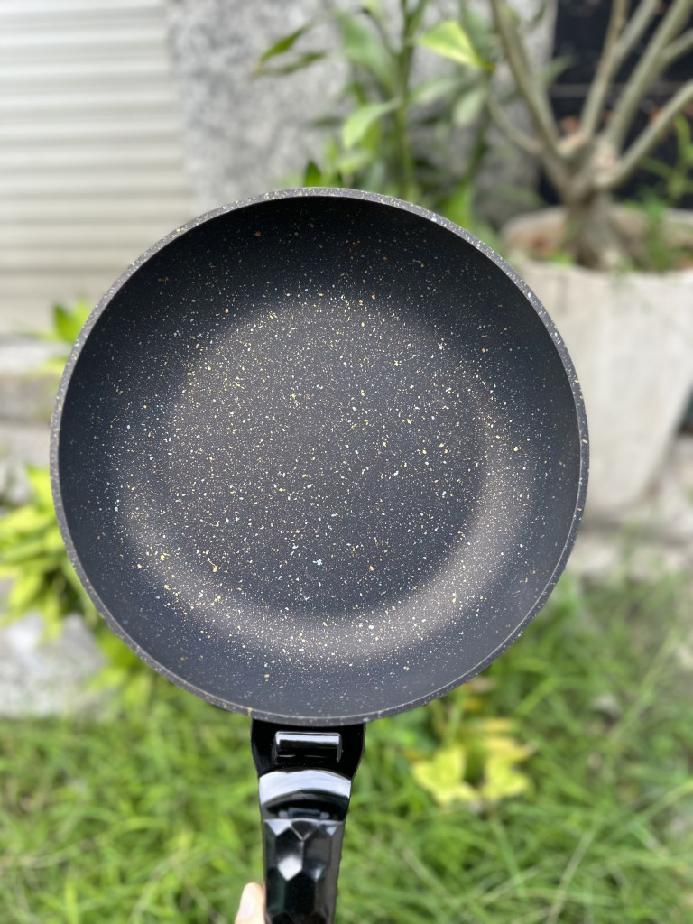 Bên cạnh đó, lòng chảo còn sử dụng kỹ thuật phun cát cố định giúp tăng độ bền và tính thẩm mỹ cho sản phẩm.Hai quai cầm dày chắc với kích thước vừa vặn, không gây vướng víu, giúp bạn cầm nắm, di chuyển chảo dễ dàng ngay cả khi đang nấu.