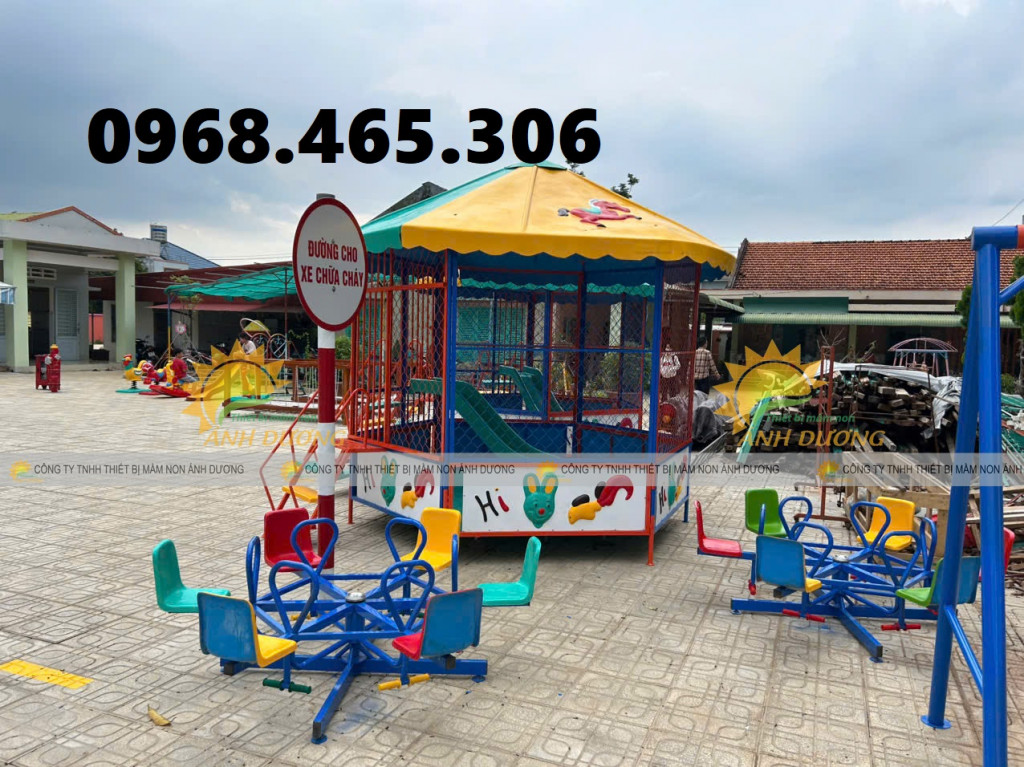 Mỗi con giống được bố trí đồ gác chân cho bé. Hệ thống khung sắt lục giác được xoay quanh trục giữa cố định. Có bạc đạn để đu quay được nhẹ nhàng êm khi di chuyển. Đế đu quay được thiết kế chừa lỗ để định vị tắc kê xuống nền bê tông.