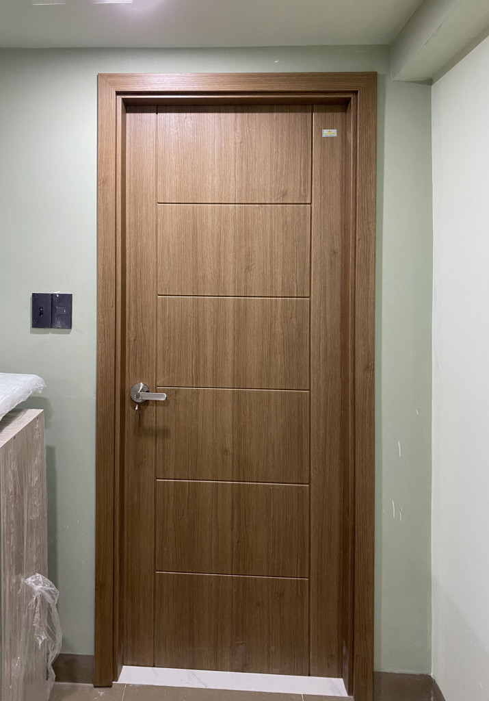 Bề mặt cửa được phủ vân gỗ hoặc sơn màu hiện đại, phù hợp với nhiều phong cách nội thất từ đơn giản đến sang trọng.