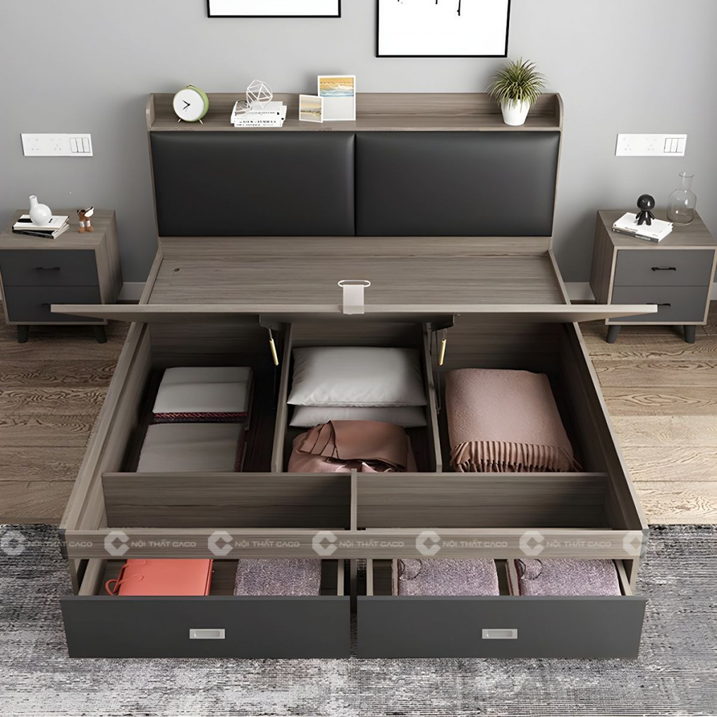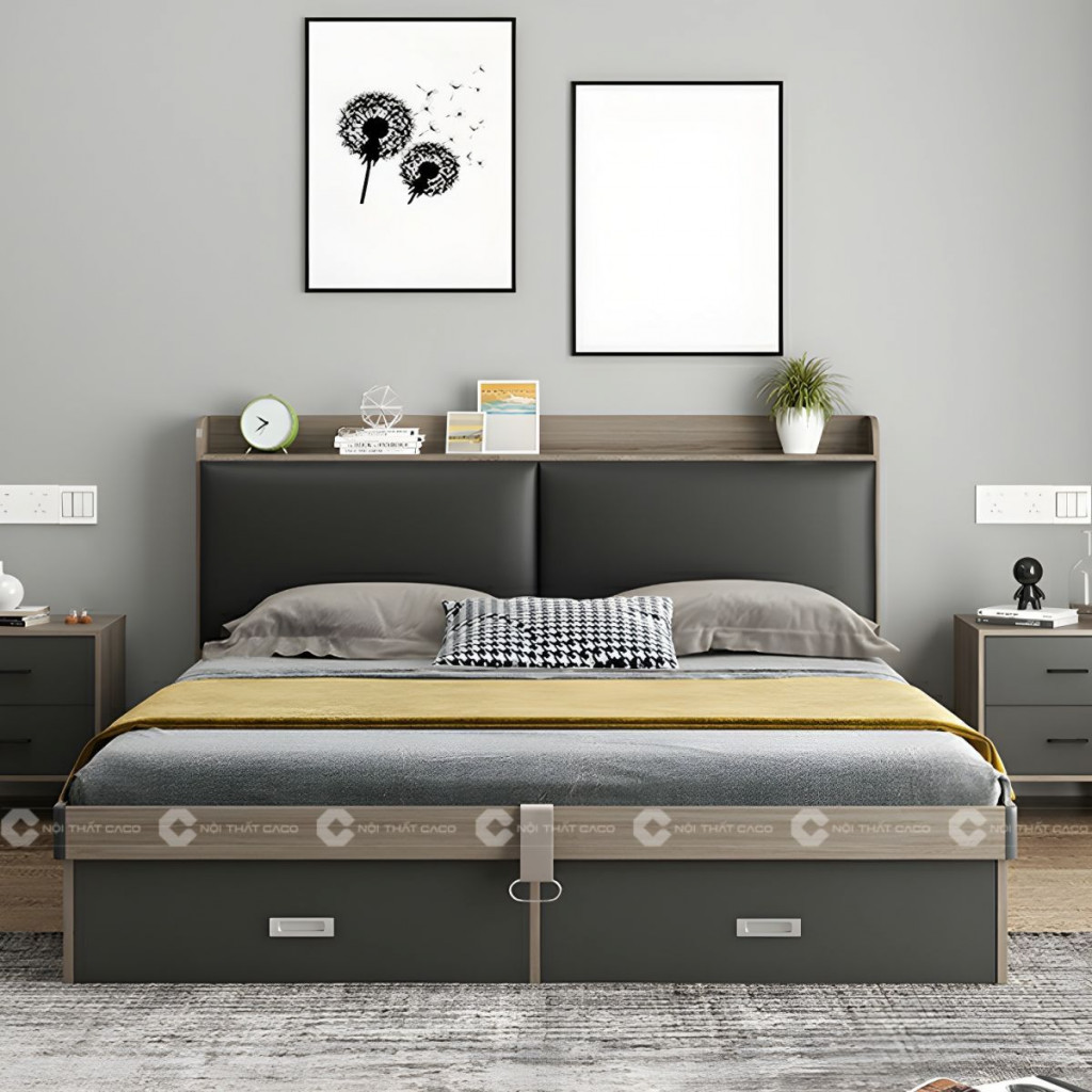 Giường Ngủ Gỗ Công Nghiệp Bọc Nệm Đầu Giường 2 Hộc Kéo