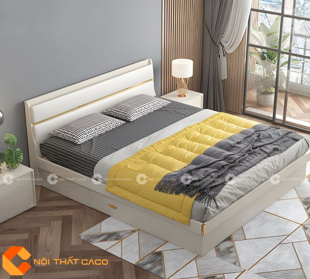 Mẫu giường ngủ gỗ công nghiệp thiết kế tích hợp hộc kéo tiện lợi. Điều này giúp tối ưu hóa không gian lưu trữ và giữ phòng ngủ luôn gọn gàng. Với gam màu trắng thanh lịch, giường dễ kết hợp với nhiều phong cách nội thất.