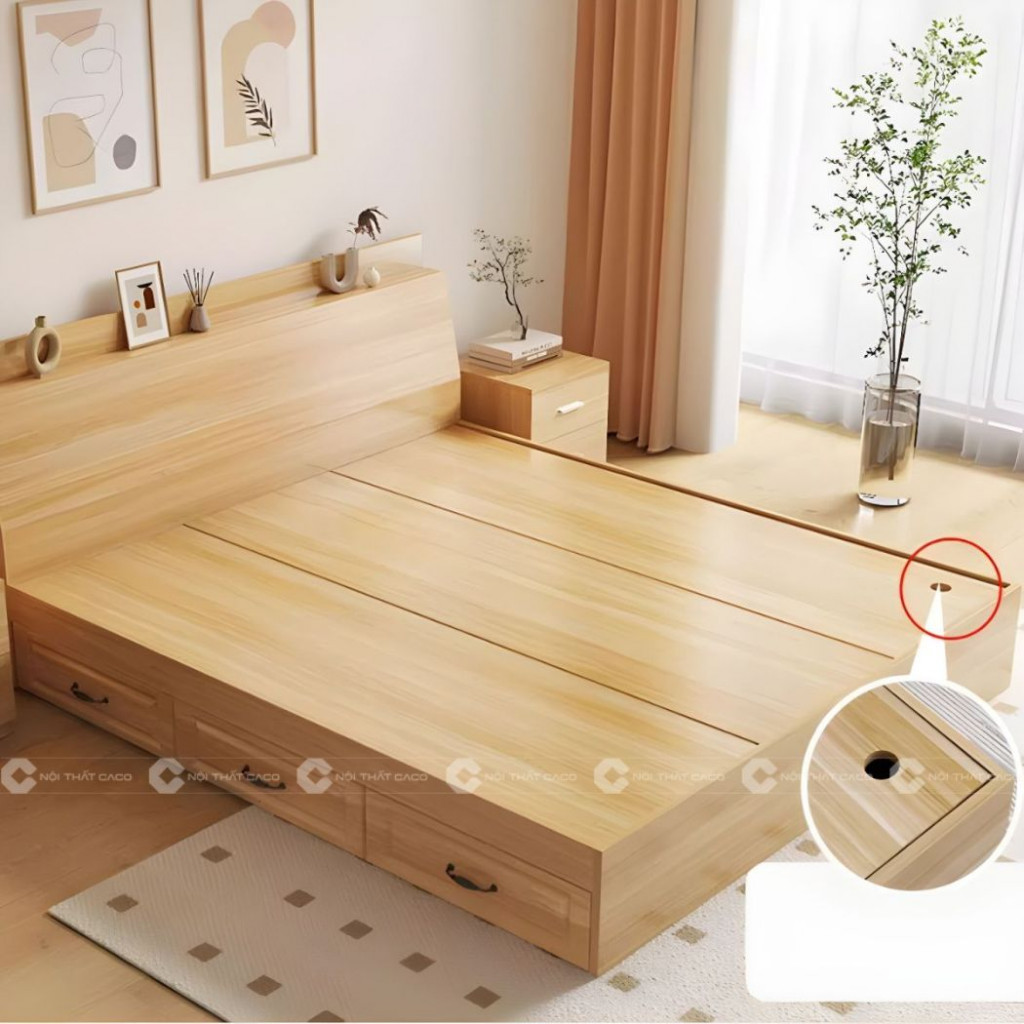 Màu vàng vân gỗ chính là điểm nhấn giúp mẫu giường ngủ gỗ công nghiệp này trở nên nổi bật. Tông màu này mang đến cảm giác ấm cúng, thư giãn, đồng thời dễ dàng phối hợp với nhiều phong cách nội thất phòng ngủ.