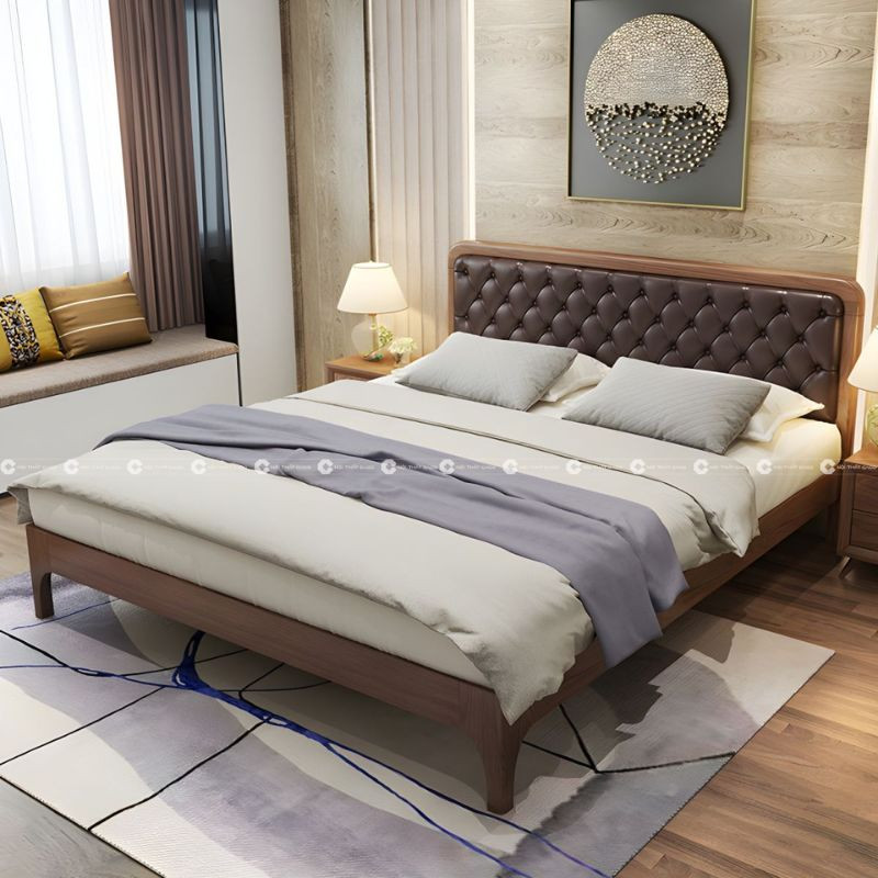 - Thiết kế tinh tế: Mẫu giường ngủ gỗ tự nhiên này ấn tượng với các đường nét bo tròn mềm mại, chạm khắc sắc sảo mang đến sự thanh lịch và hiện đại.