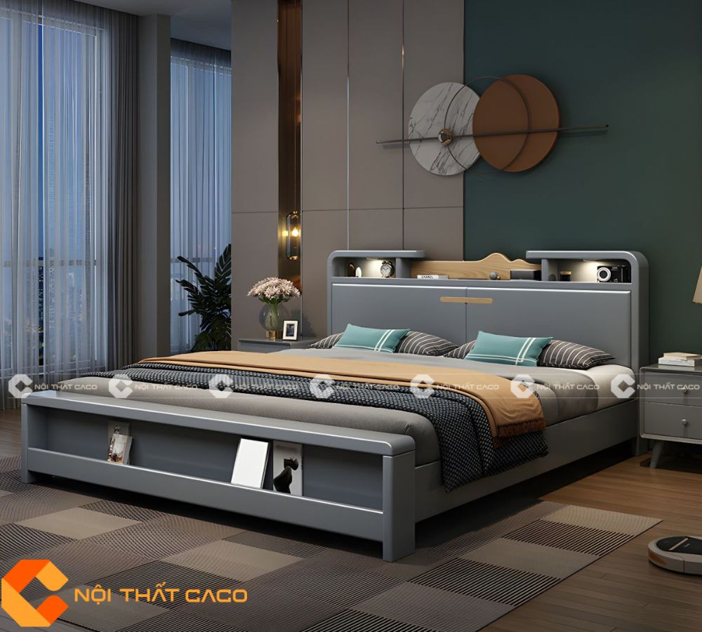 Bề mặt giường ngủ gỗ tự nhiên được phủ sơn màu xám láng mịn, tạo nên vẻ đẹp hiện đại và sang trọng. Từng chi tiết của giường được hoàn thiện tỉ mỉ, mang lại cảm giác cao cấp và đẳng cấp.