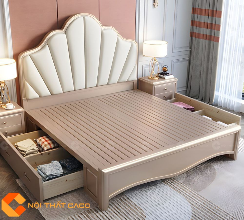 Giường Ngủ Gỗ Tự Nhiên Bọc Da Tích Hợp Ngăn Kéo Thông Minh