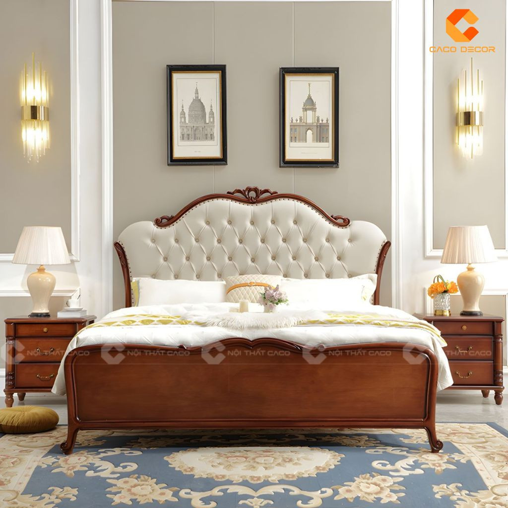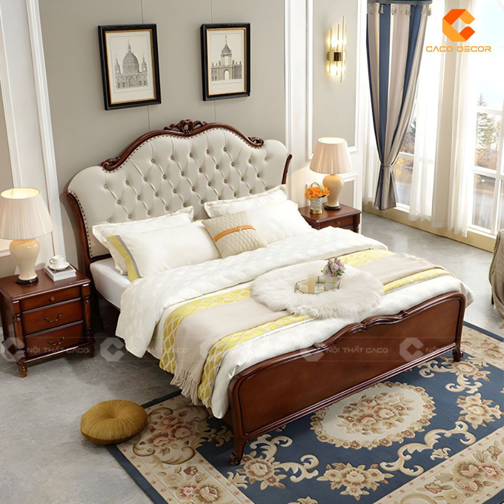 "Giường ngủ gỗ tự nhiên bọc đầu nệm sang trọng mang phong cách tân cổ điển châu Âu. Giường ngủ được chế tác từ gỗ tự nhiên cao cấp, toát lên vẻ sang trọng và có độ bền vượt thời gian.