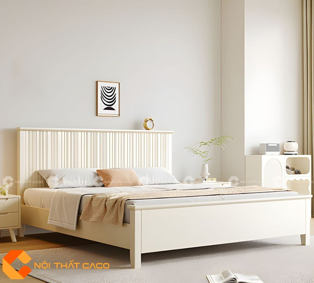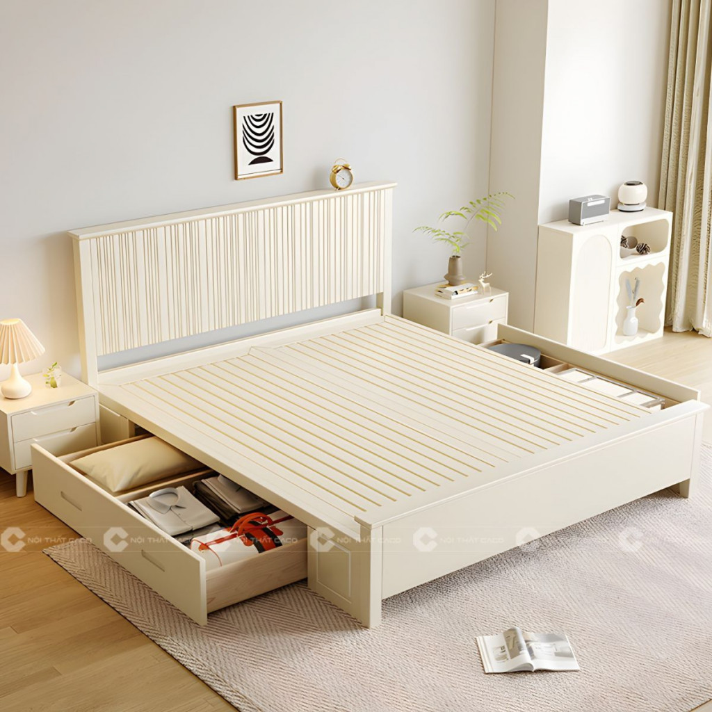 Giường Ngủ Gỗ Tự Nhiên Màu Trắng Có Hộc Kéo Hiện Đại