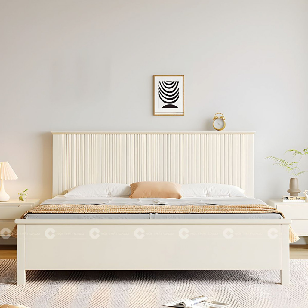"Mẫu giường ngủ gỗ tự nhiên màu trắng có hộc kéo phù hợp mọi phòng ngủ của căn hộ hay biệt thự. Giường ngủ được chế tác hoàn toàn từ gỗ tự nhiên cao cấp, nổi bật với độ bền chắc và khả năng chịu lực tốt.