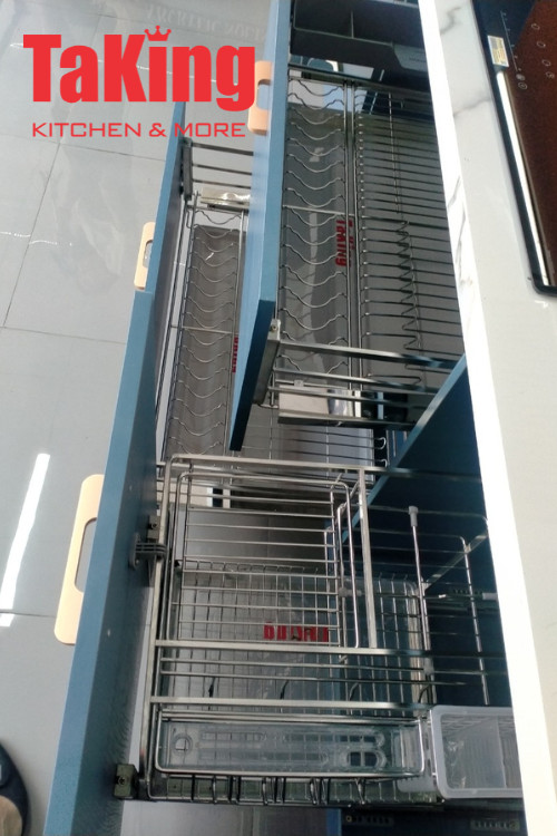 Kệ bát đĩa nan dẹt TaKing sử dụng hệ thống ray trượt giảm chấn nên kéo mở dễ dàng và không gây ra tiếng ồn ảnh hưởng tới các hoạt động xung quanh khi sử dụng.