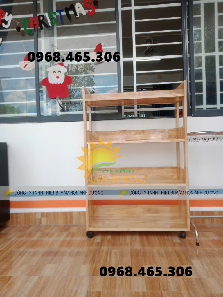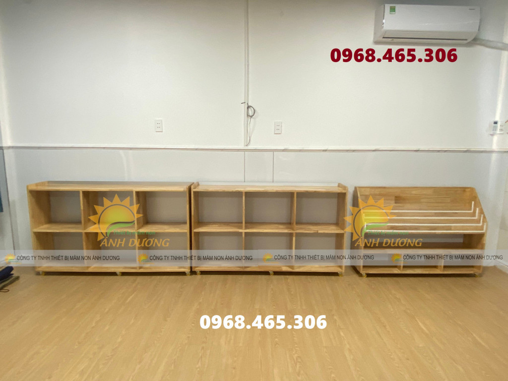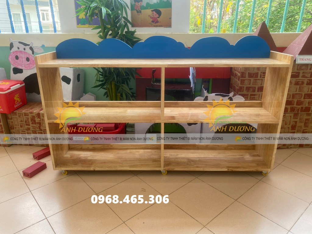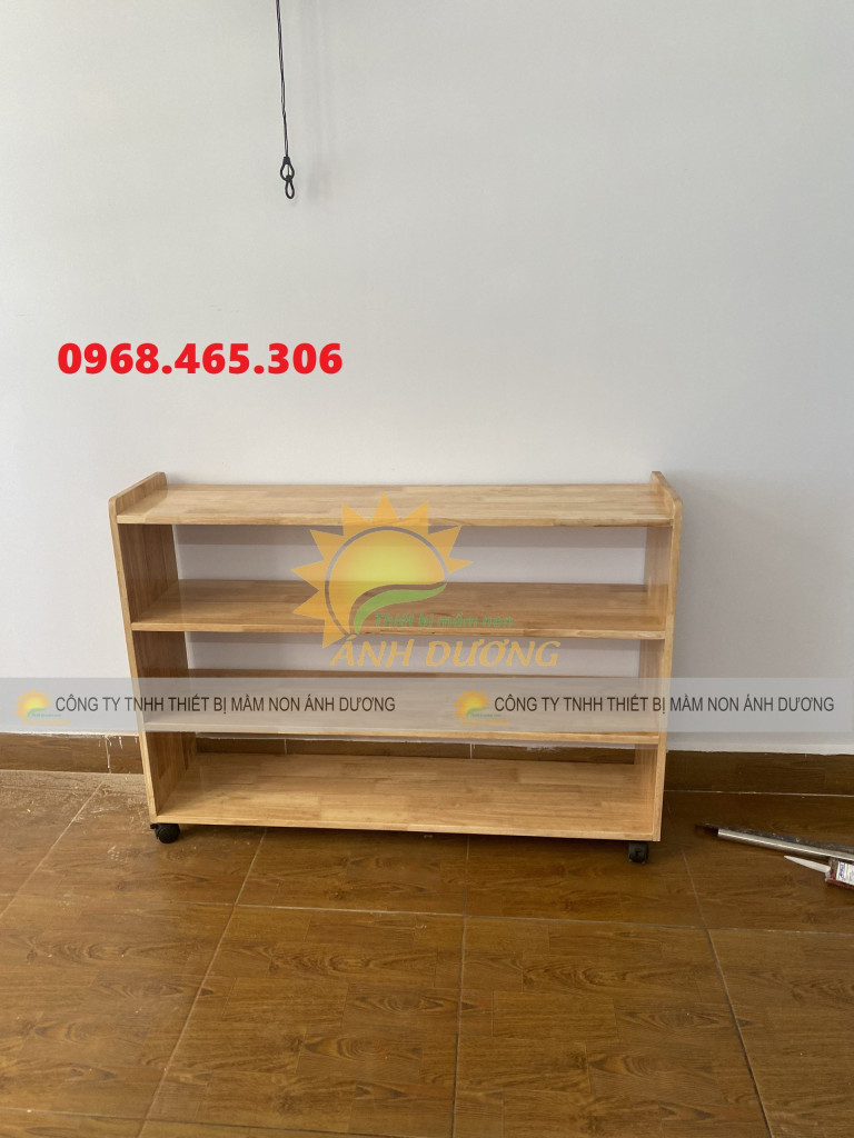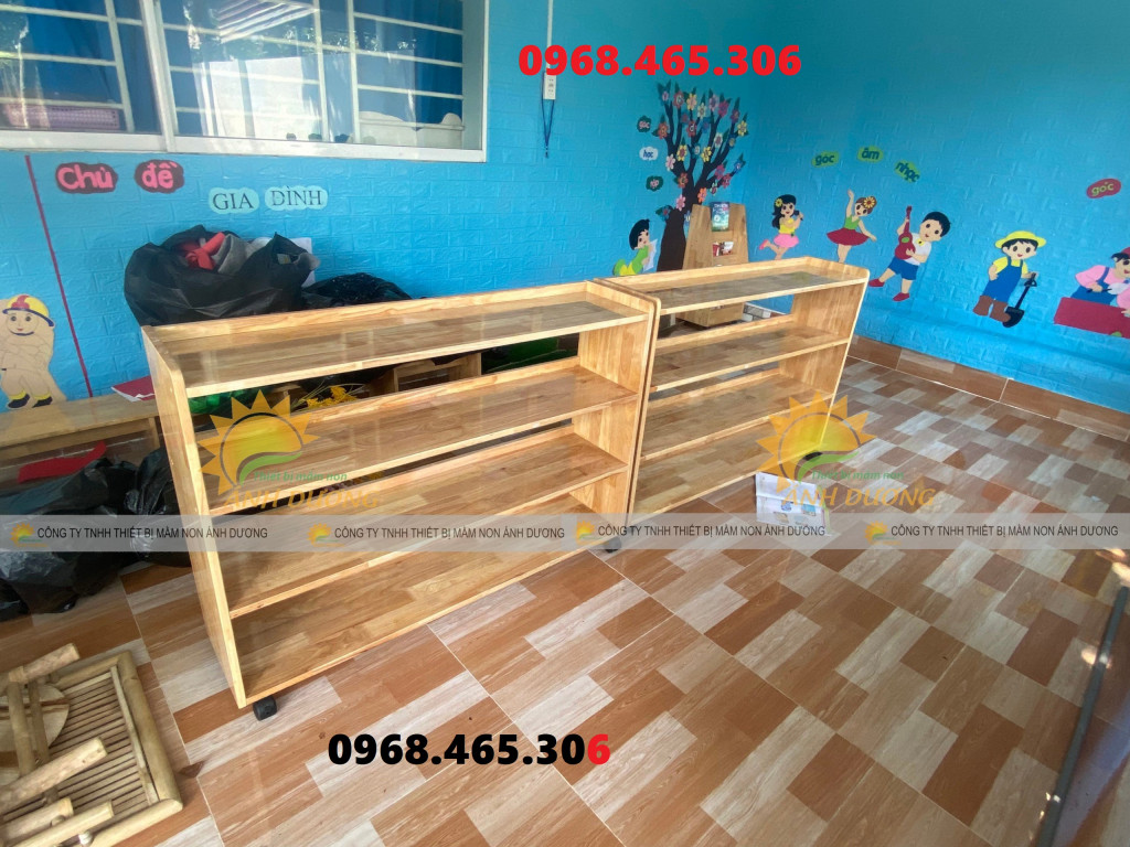 Kệ học liệu mầm non, kệ gỗ cao su mầm non