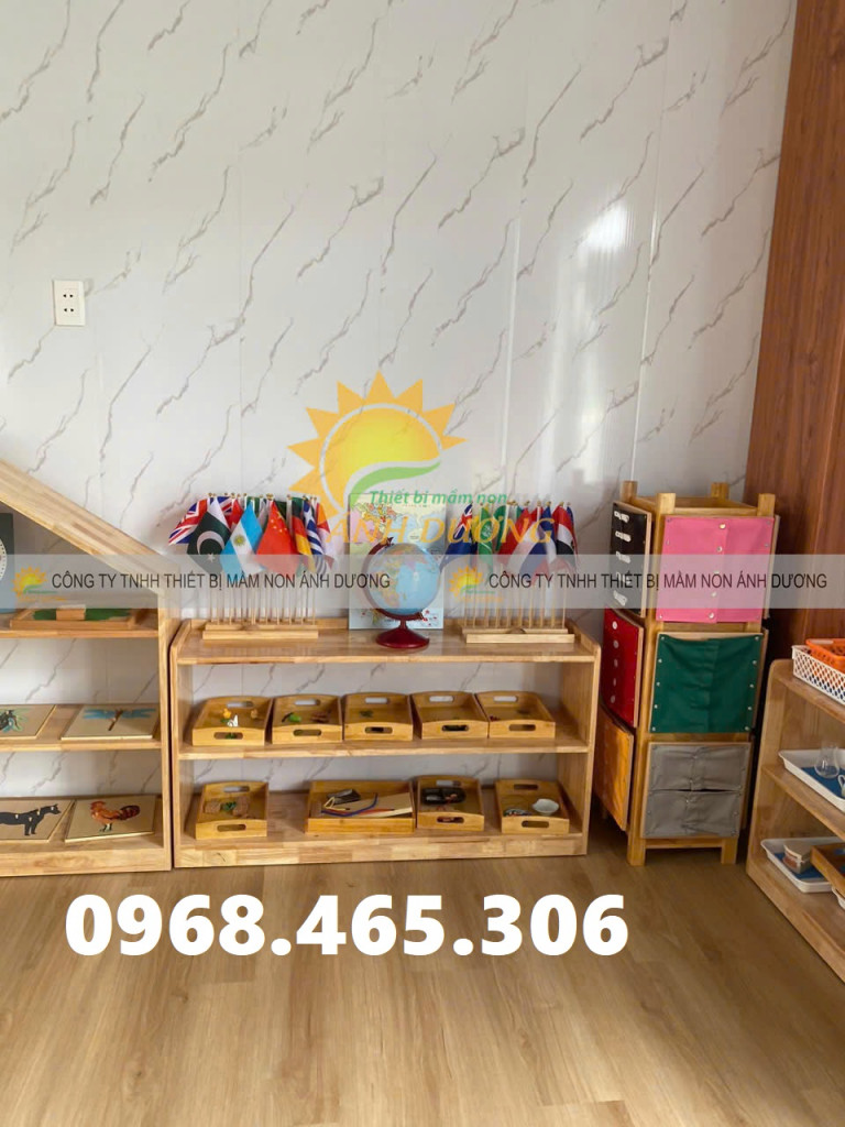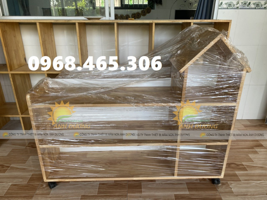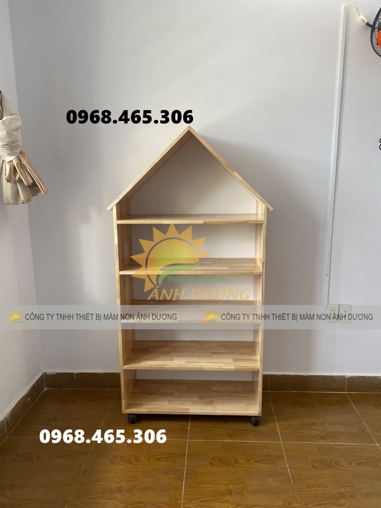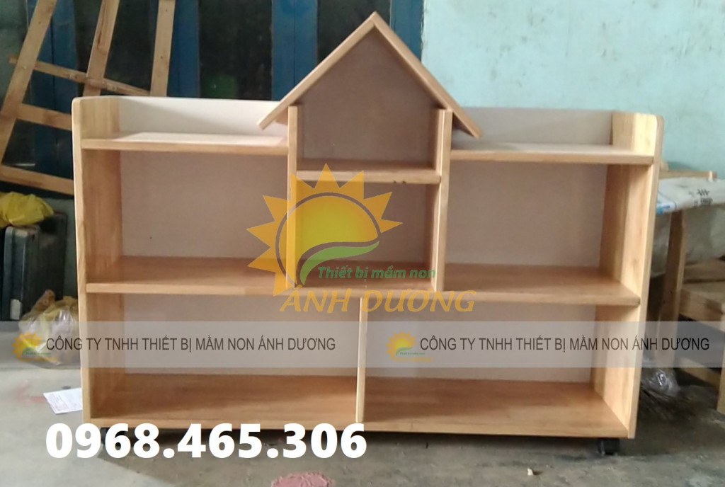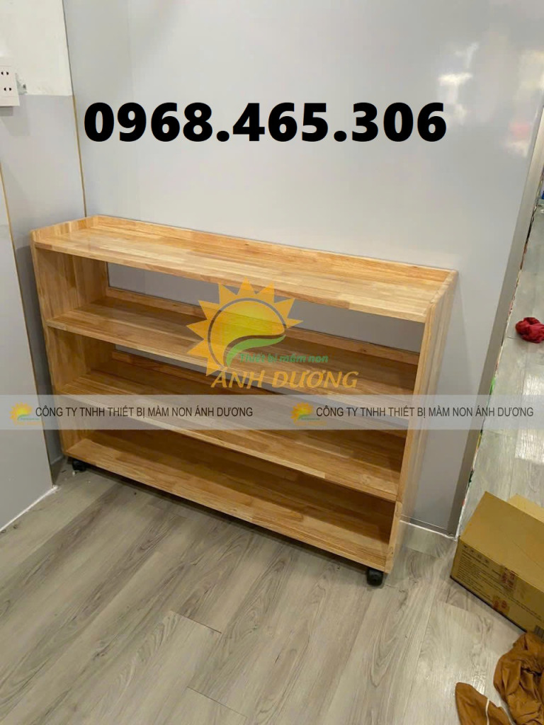 Kệ học liệu mầm non, kệ gỗ cao su mầm non