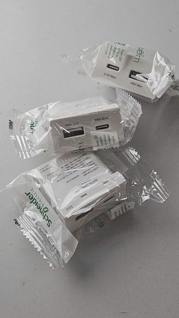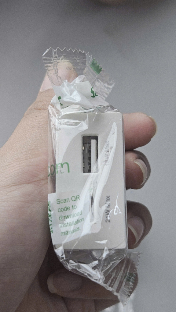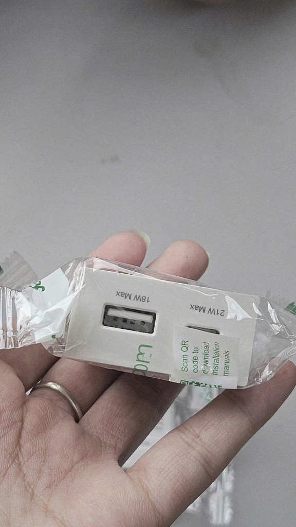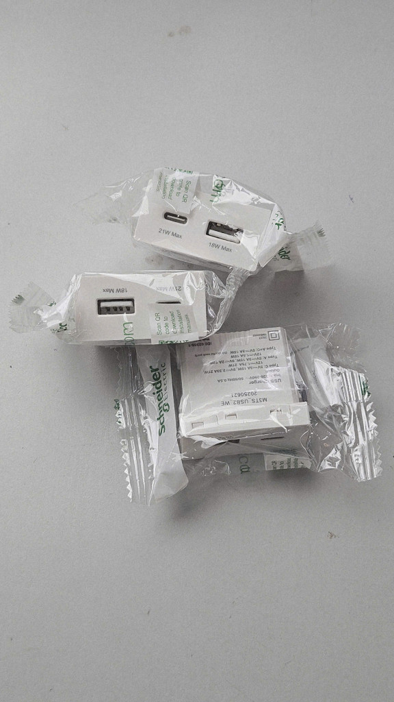 Nhãn hiệu & Xuất xứ: Sản phẩm ổ cắm USB 2 cổng (A + C) Miluz E của Schneider Electric, được sản xuất tại Việt Nam.