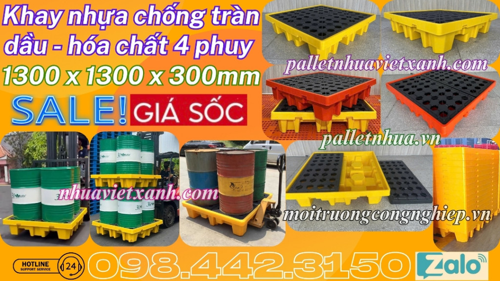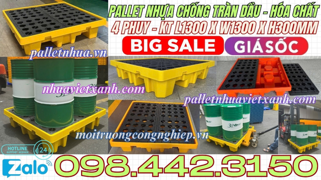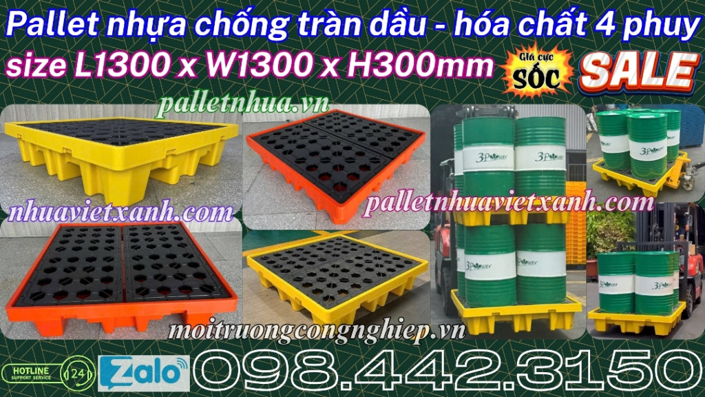 Pallet chống tràn 4 phuy - pallet nhựa chống tràn 4 phuy - pallet nhựa chống tràn dầu - hóa chất 4 phuy - khay nhựa chống tràn 4 phuy - pallet nhựa chống tràn BVMT 4 phuy