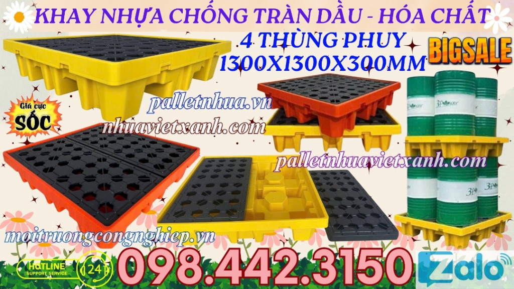 - Pallet nhựa chống tràn 4 phuy - khay nhựa chống tràn 4 phuy kích thước 1300x1300x300mm đáp ứng các quy định về ngăn tràn cho tối đa 4 thùng phuy và tuân thủ các yêu cầu về ngăn tràn của SPCC và EPA.