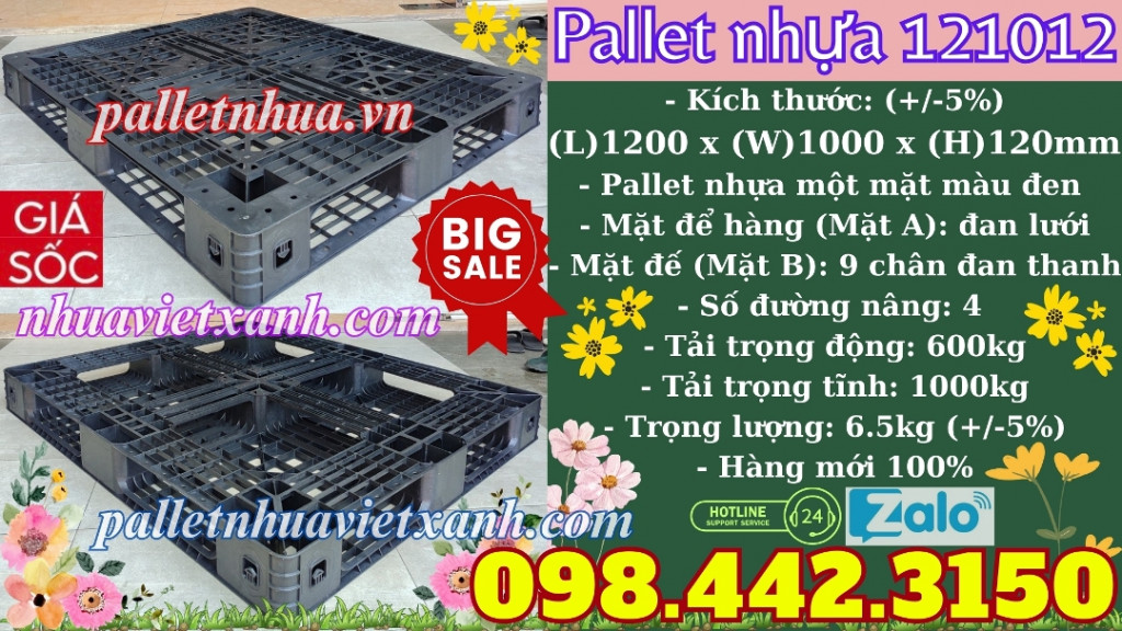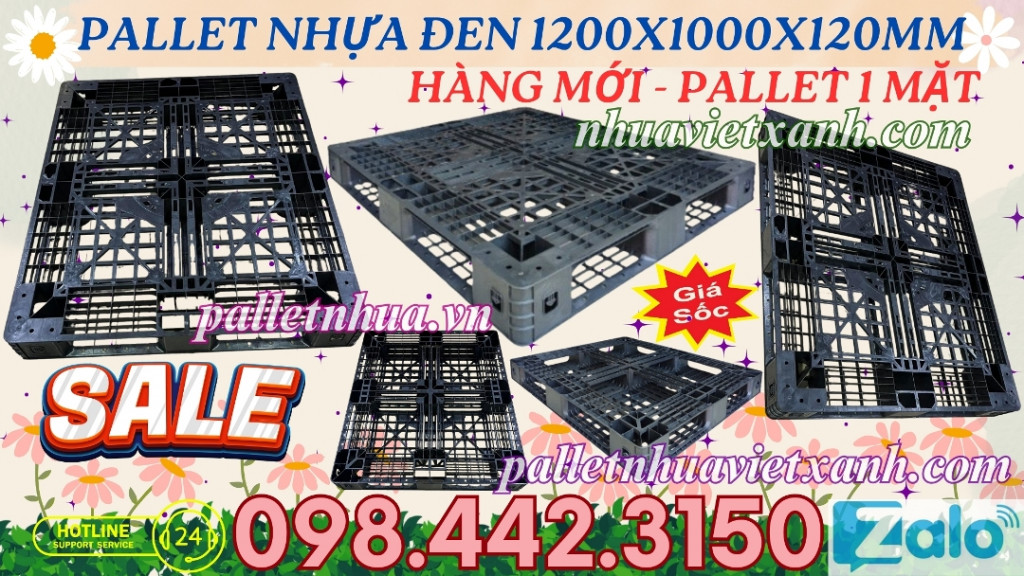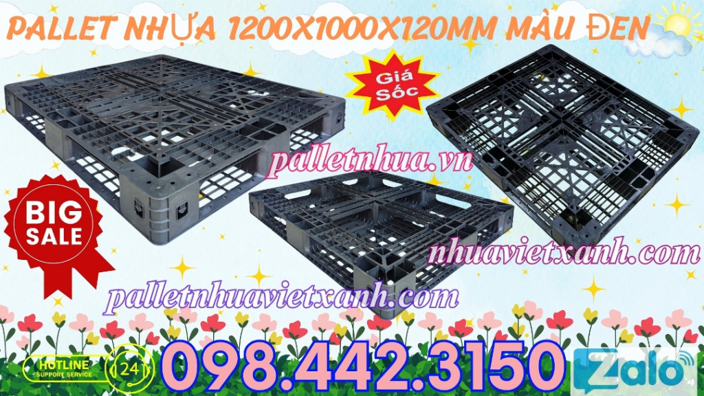 - Pallet nhựa màu đen 1200x1000x120mm là loại pallet liền khối, được sản xuất từ nhựa tái sinh và được phủ chất chống tia UV có thể chịu được nhiệt độ cao ngoài trời.