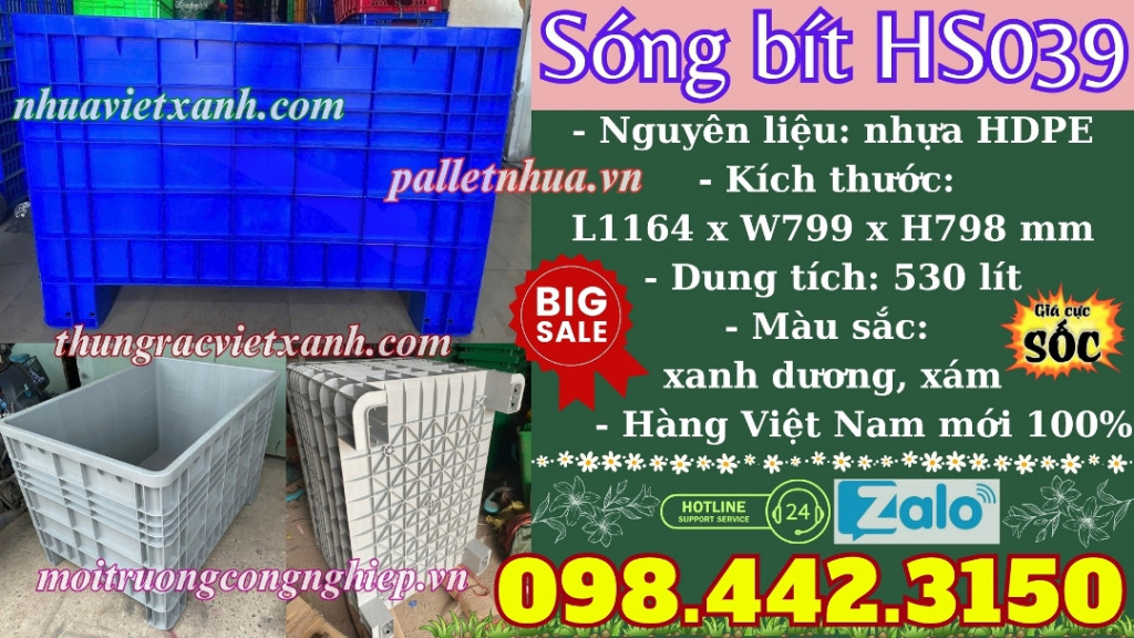 Sóng nhựa bít HS0039 với sức chứa lên đến 530 lít được sản xuất từ nhựa HDPE chính phẩm, có khả năng chứa được nhiều sản phẩm cùng lúc và có thể chứa đựng những sản phẩm có kích thước lớn, sản phẩm được thiết kế với 4 chân trụ giúp mặt đáy sóng cách sàn nên sẽ bảo quản tốt sản phẩm bên trong khỏi các yếu tố tác động từ môi trường. Đây là lựa chọn lý tưởng giúp người kinh doanh và doanh nghiệp giải quyết bài toán cho việc lưu trữ và vận chuyển những hàng hóa có số lượng lớn - trọng lượng cao.