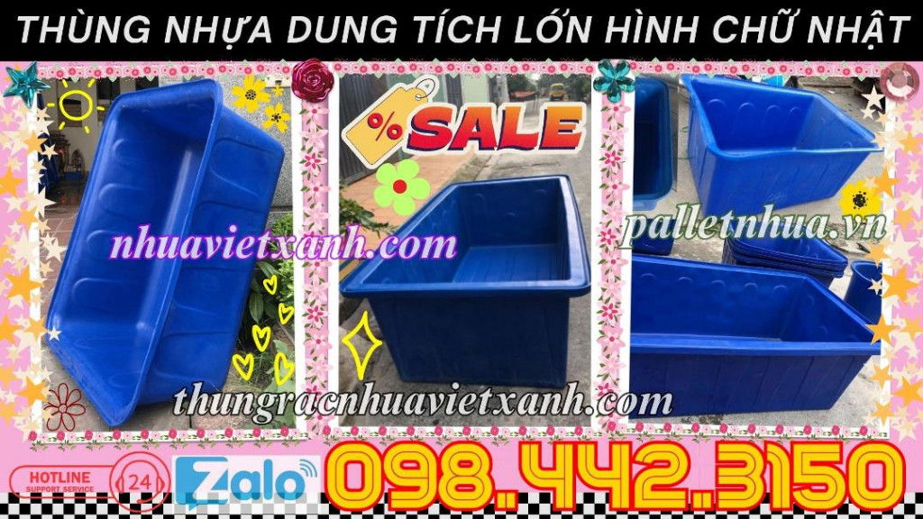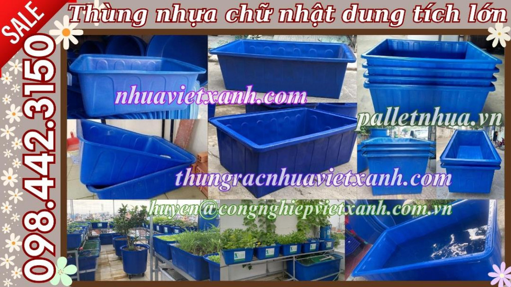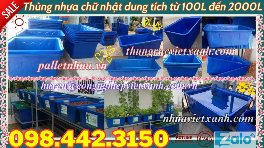 *. Thùng nhựa chữ nhật dung tích lớn - thùng nhựa dung tích lớn - tank nhựa thường được sử dụng nhiều trong trồng trọt, ngành thủy hải sản, ngành xây dựng hay trong đời sống...để trồng rau, trồng cây, trồng rau xanh, trồng ra sạch, chứa nước, đựng nước, nuôi cá, nuôi tôm, nuôi lươn, nuôi ốc, nuôi cá Koi, làm bể bơi,...và với đặc điểm lớn nhất là kháng acid, kháng kềm, không tan trong dung môi và không phân cực nên thùng còn được dùng để đựng hóa chất, dung môi, thuốc nhuộm vải,...Ngoài ra thùng còn được dùng rất nhiều trong Hệ thống Aquaponics - rau xanh cá sạch.