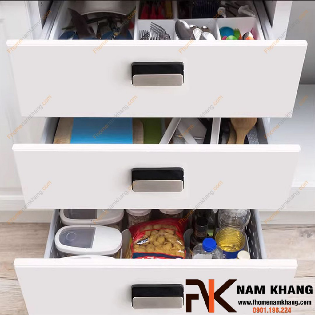 Tay nắm tủ hiện đại NK446S được thiết kế tối giản nhưng tinh tế, kết hợp hai gam màu sang trọng, dễ dàng hòa hợp với nhiều phong cách nội thất.