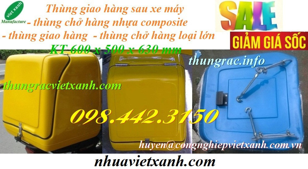 Công ty SX Việt Xanh chuyên sản xuất và phân phối thùng chở hàng sau xe máy, thùng giao hàng bằng nhựa composite với nhiều mẫu mã và màu sắc thiết kế tùy theo yêu cầu của khách hàng với các kích thước cỡ nhỏ, cỡ trung, cỡ lớn, cỡ đại và cỡ max…phù hợp với từng nhu cầu sử dụng của khách hàng.