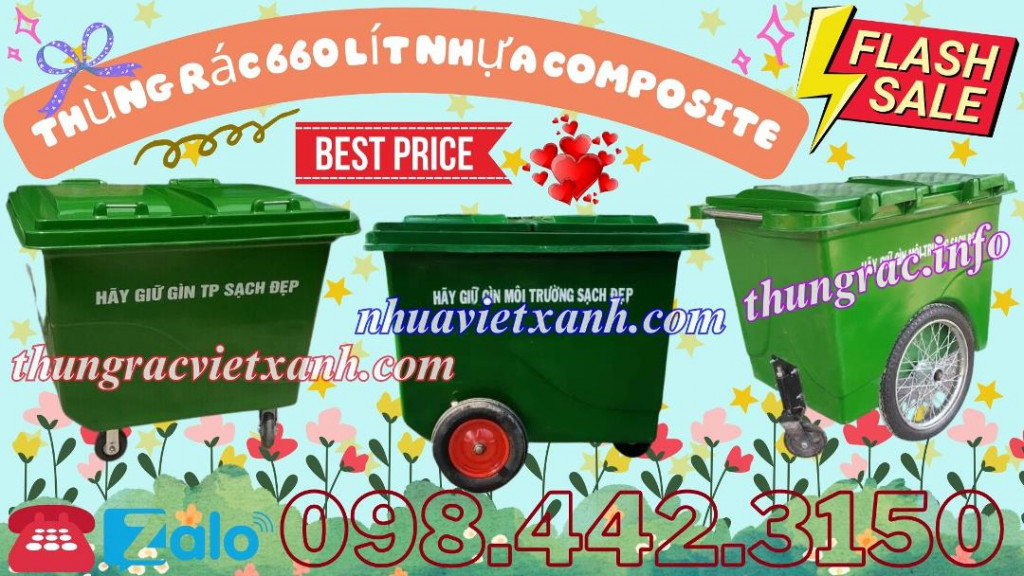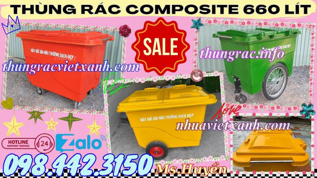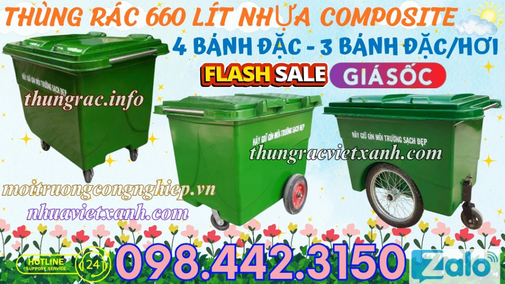 - Thùng rác composite 660 lít - xe rác composite 660 lít thích hợp chứa các loại rác thải nguy hại, chống cháy và ăn mòn do axit thức ăn hay hóa chất.