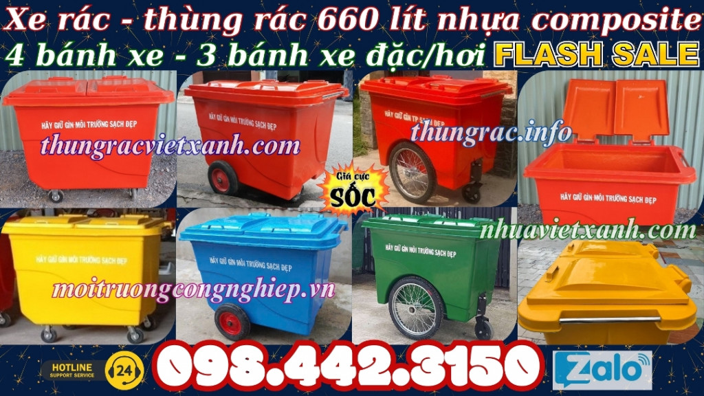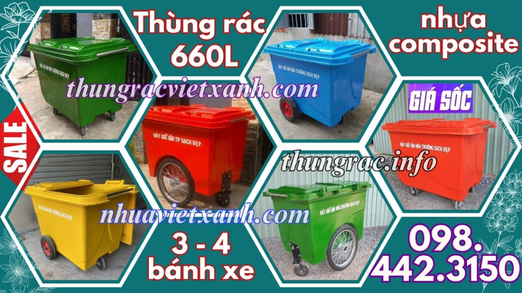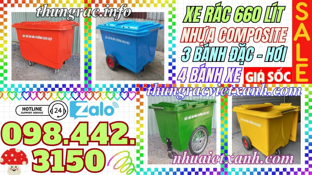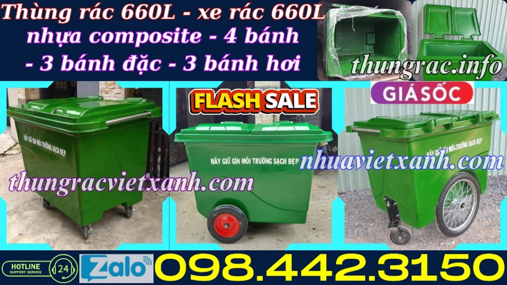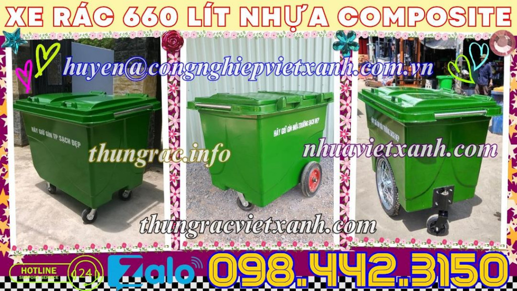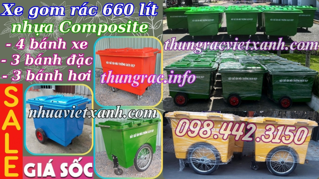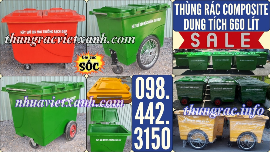 - Thùng rác 660 lít - xe rác 660 lít - xe đẩy rác 660 lít - xe thu gom rác 660 lít - xe gom rác 660 lít nhựa composite có dung tích lớn để thu gom rác từ những thùng rác nhỏ và vận chuyển điểm tập kết. Thích hợp đặt ở nơi thu gom rác tập trung của chung cư, cao ốc, khuôn viên khu công nghiệp, nhà máy, công viên, khu vui chơi giải trí, các khu du lịch, trường học, bệnh viện, nhà hàng khách sạn, trung tâm thương mại, siêu thị, nơi công cộng…