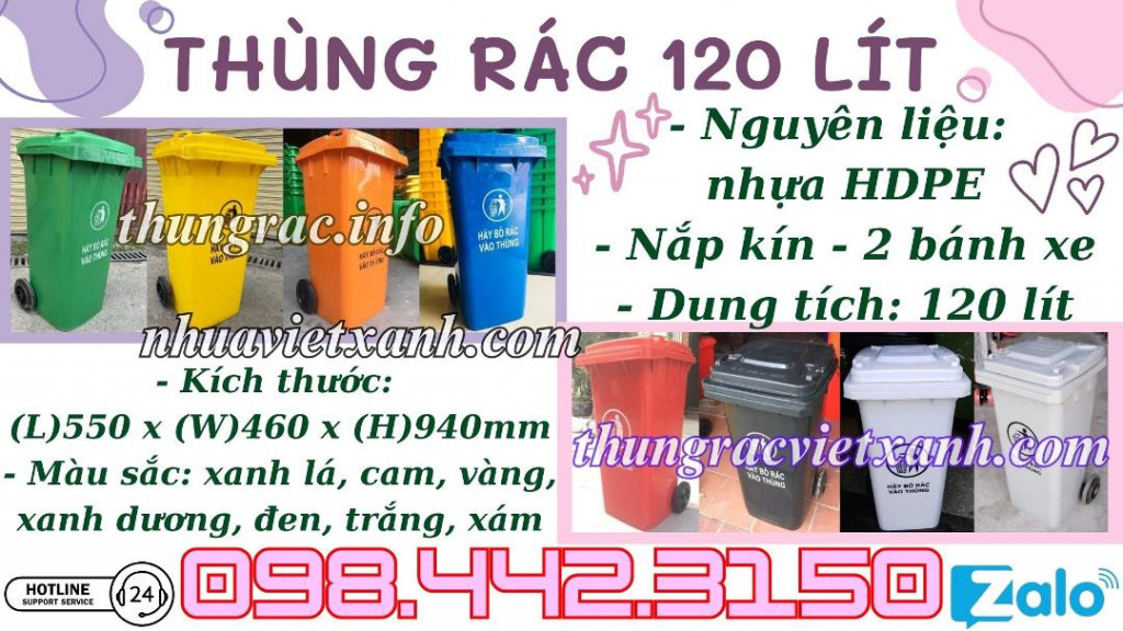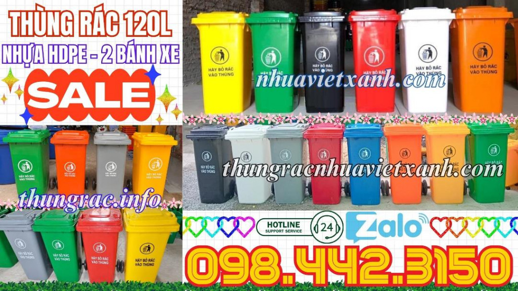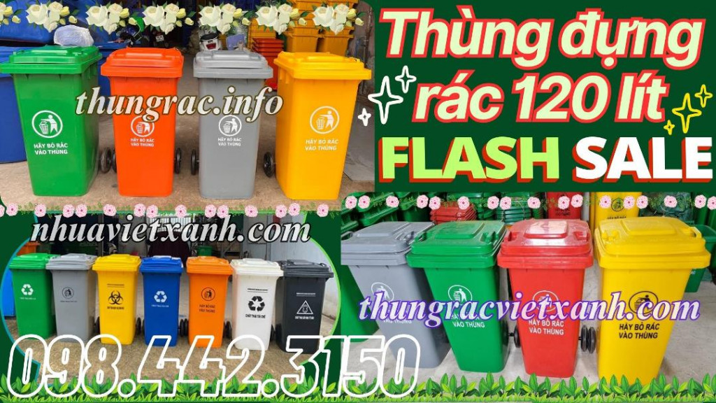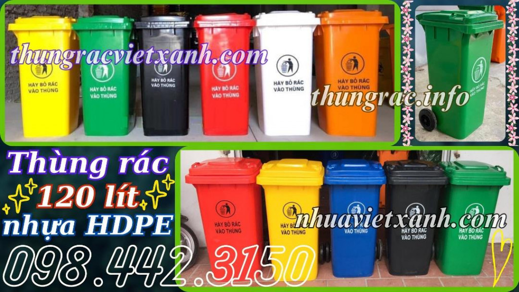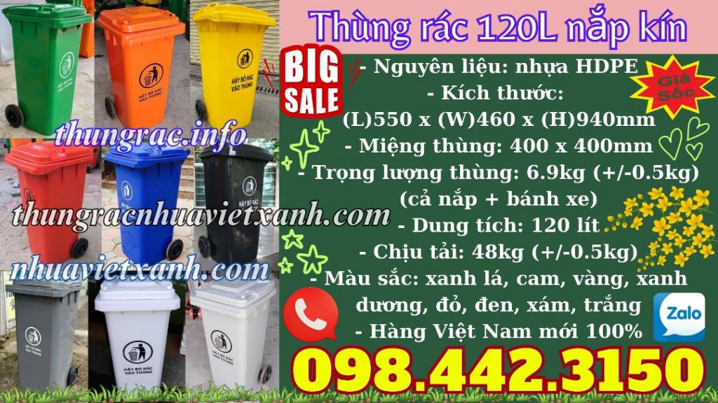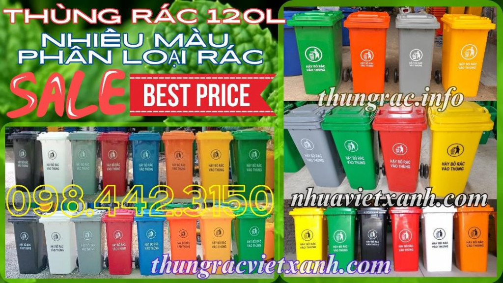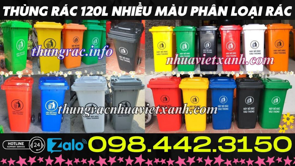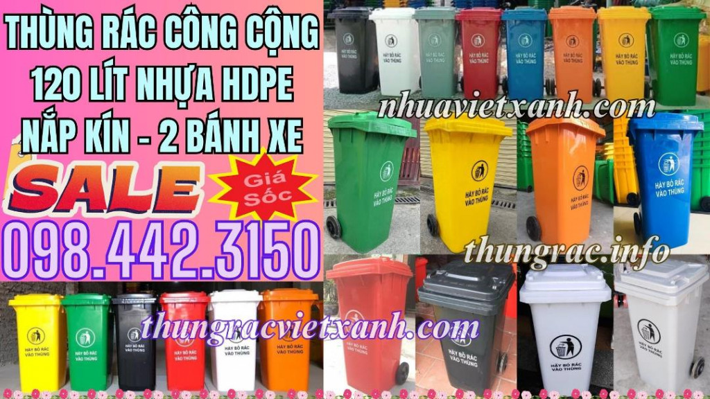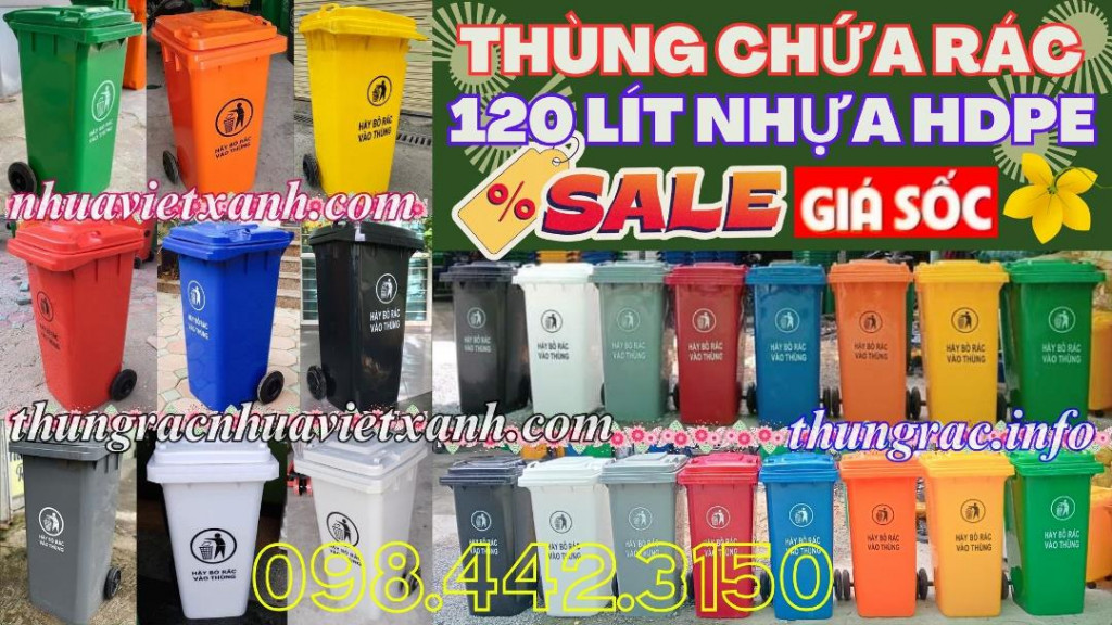 *. Thùng rác nhựa 120 lít nắp kín có nhiều màu sắc khác nhau như xanh lá, cam, vàng, xanh dương, đỏ, đen, trắng, xám,... giúp phân loại rác thải dễ dàng ngay từ nguồn, hỗ trợ công tác tái chế và xử lý rác thải hiệu quả.