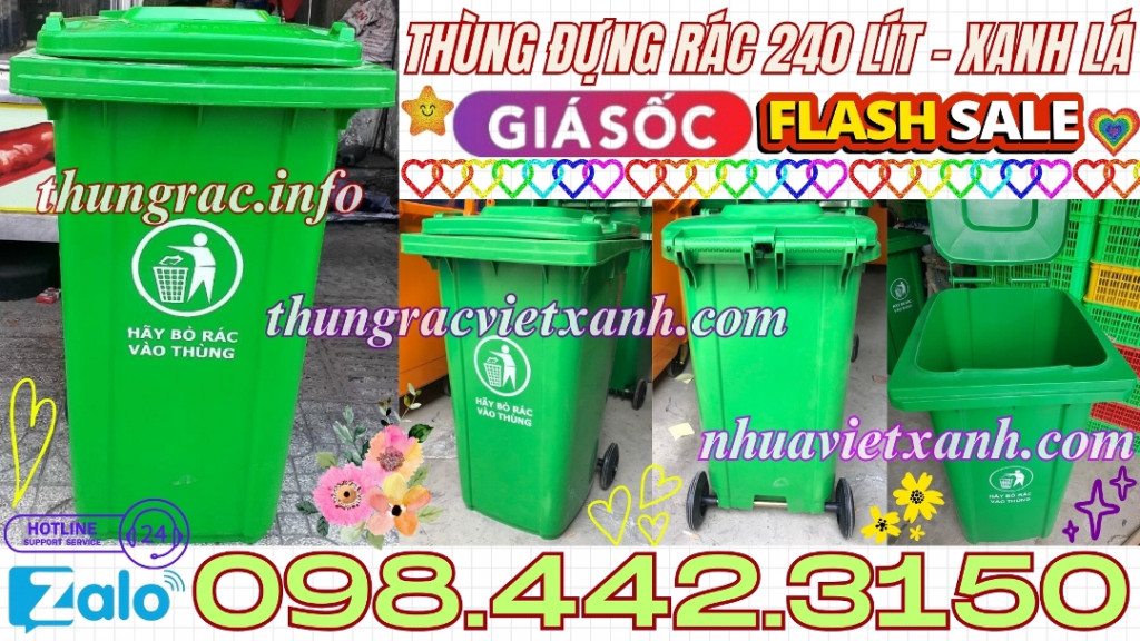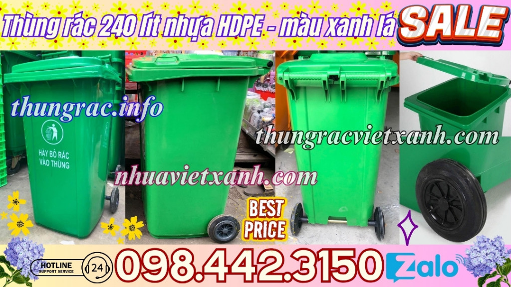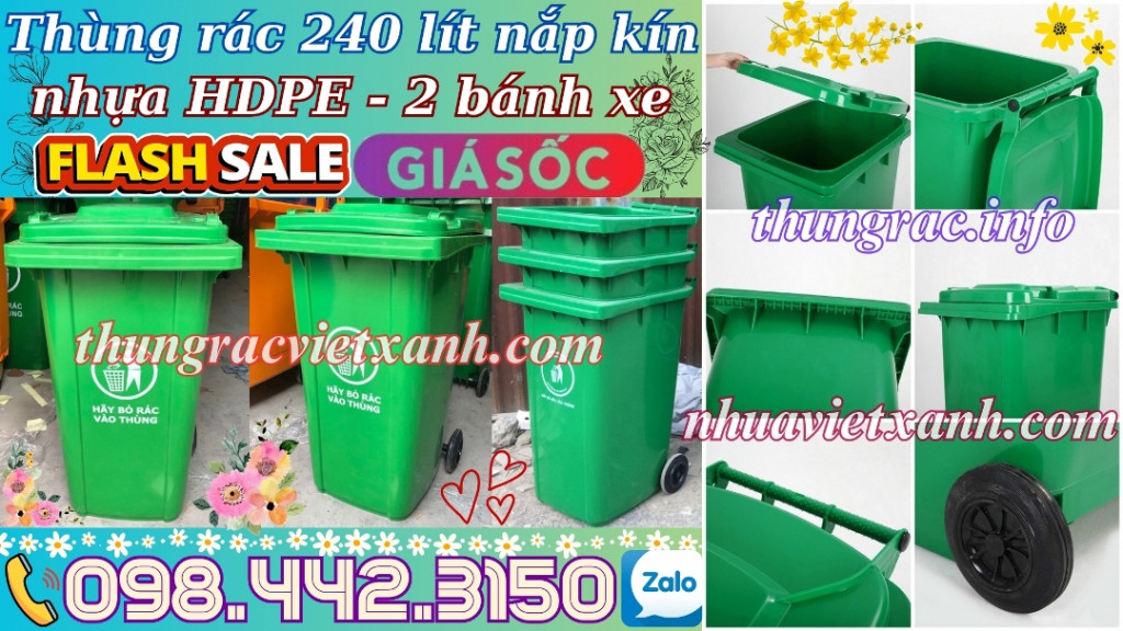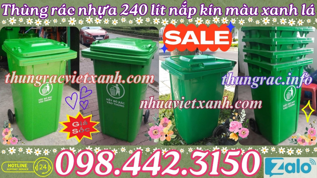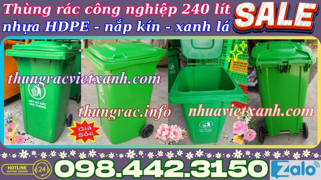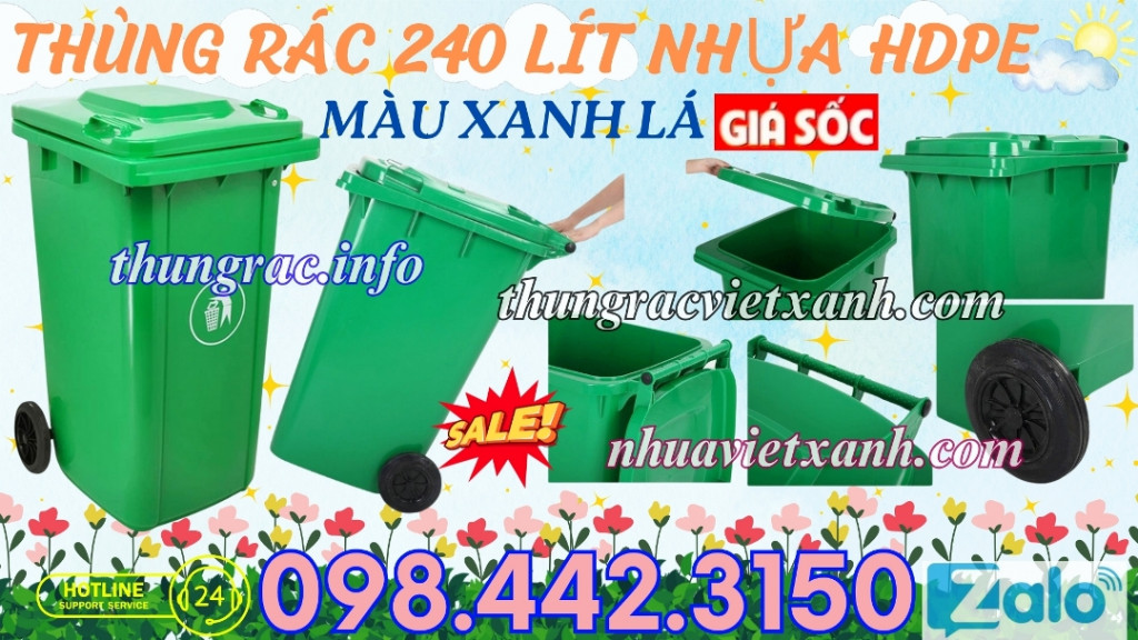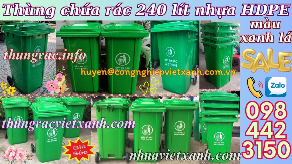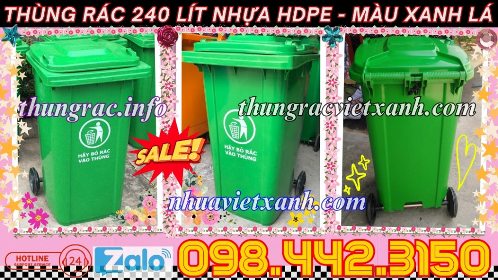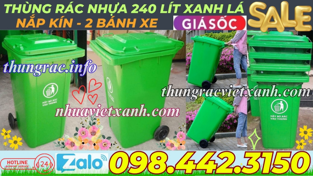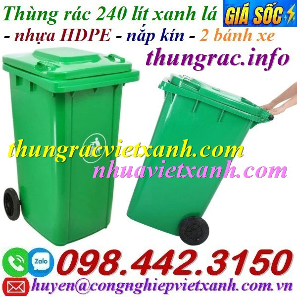 - Thùng rác 240 lít nhựa HDPE - nắp kín - 2 bánh xe - màu xanh lá phù hợp với các loại xe cẩu, xe gom rác đang được sử dụng tại Việt Nam.