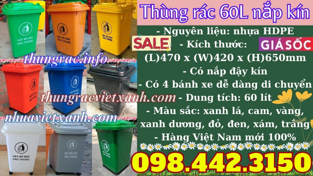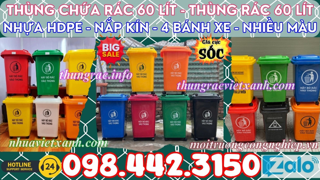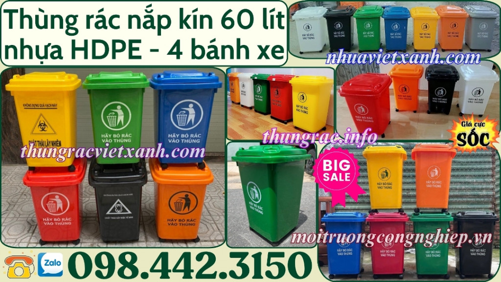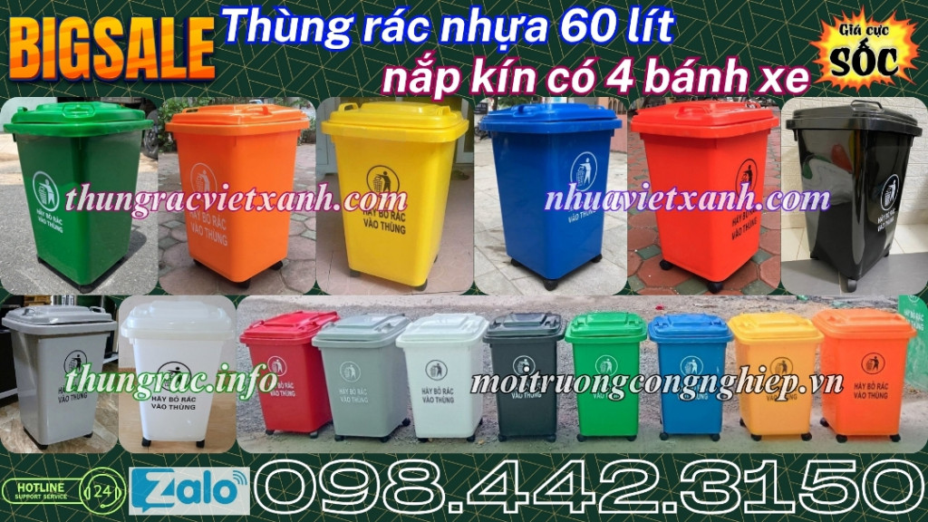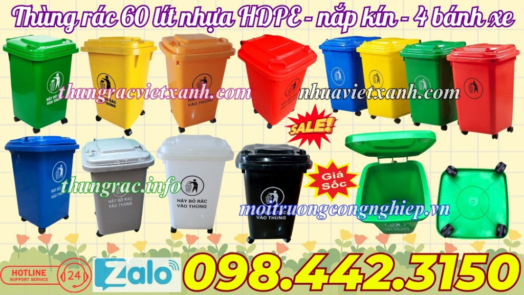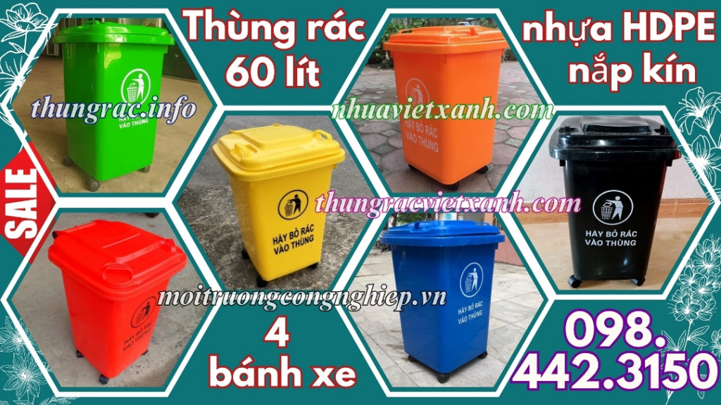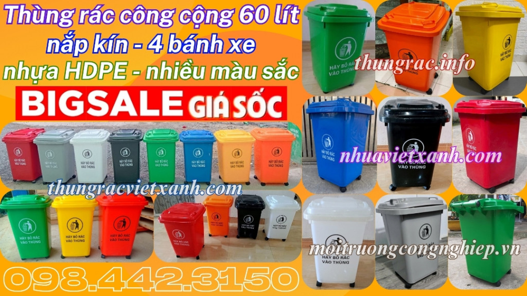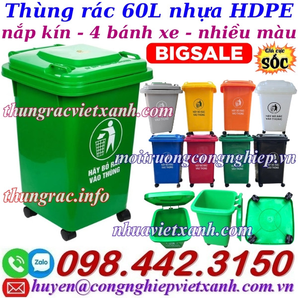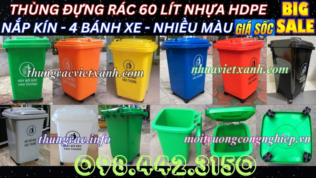 Thùng rác 60 lít - thùng rác nhựa 60 lít - thùng rác 60 lít có 4 bánh xe với thiết kế nhỏ gọn được sản xuất từ nguyên liệu nhựa HDPE có đặc tính bền, nhẹ, dẻo dai và thùng có nhiều màu sắc như xanh lá, cam, vàng, xanh dương, đỏ, trắng, đen, xám...thích hợp dùng để phân loại rác thải tại nguồn theo quy định nên dòng sản phẩm này hiện tại rất được ưa chuộng.