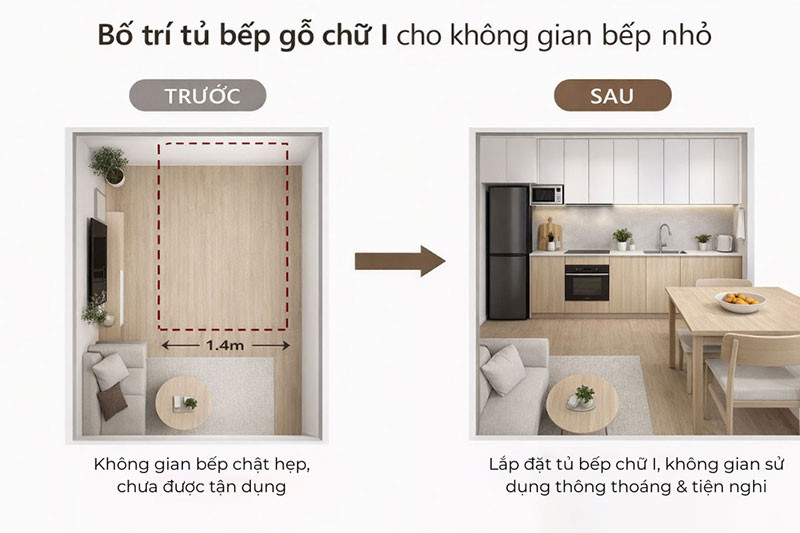 🍳🌿 TỦ BẾP GỖ CHỮ I NHỎ GỌN – GIẢI PHÁP “CỨU CÁNH” CHO BẾP HẸP 🌿🍳
