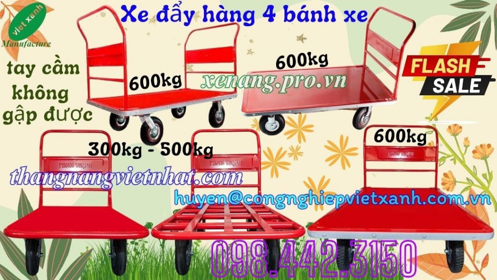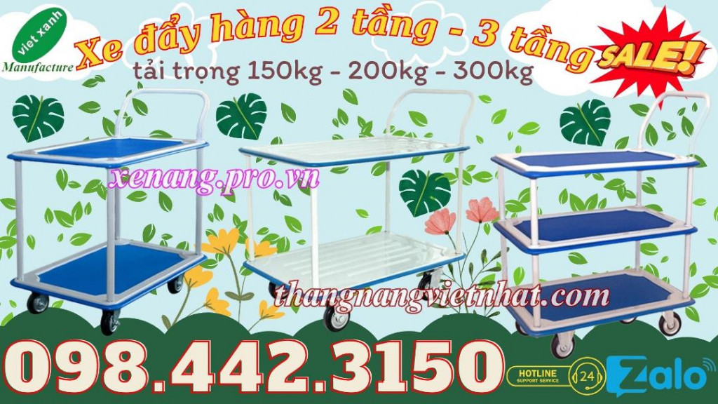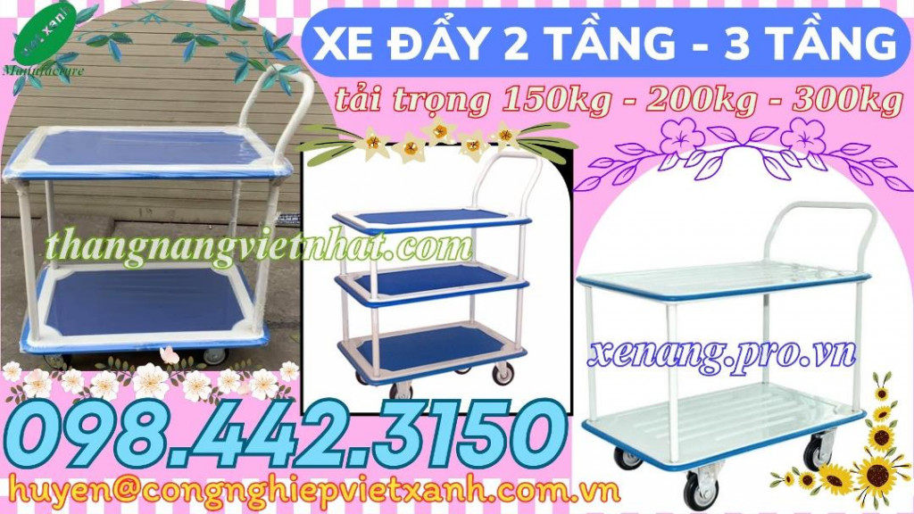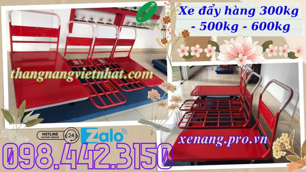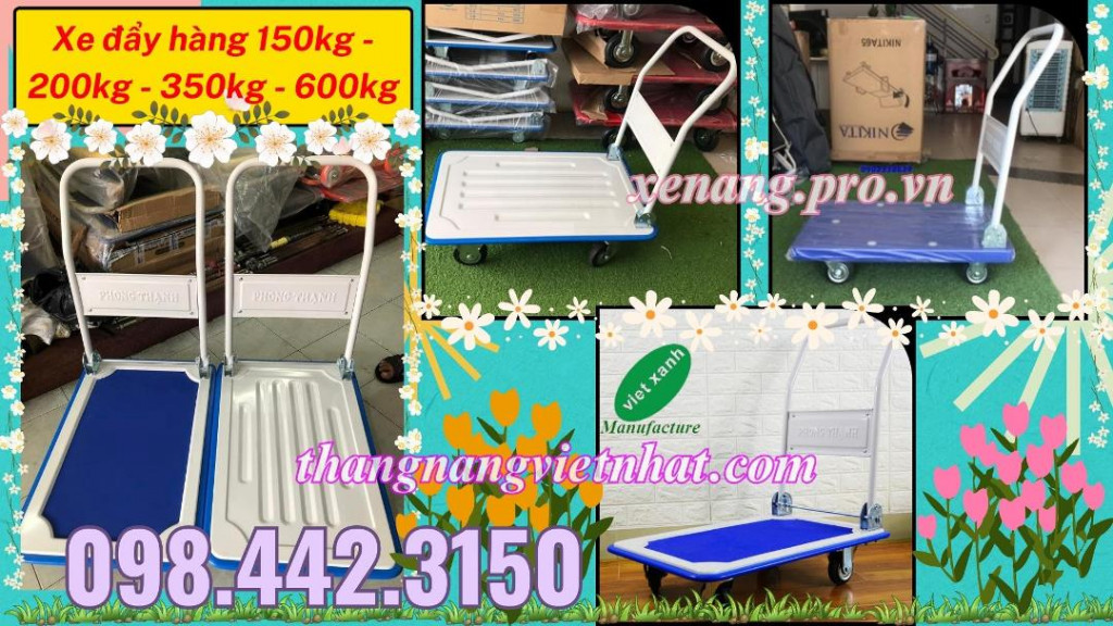 *. Có nhiều loại xe đẩy hàng khác nhau - tải trọng từ 150kg đến 600kg - có 2 bánh xe hoặc 4 bánh xe - loại 1 tầng, 2 tầng hoặc 3 tầng - tay cầm gập được và không gập được - mặt sàn thép hoặc mặt sàn nhựa.