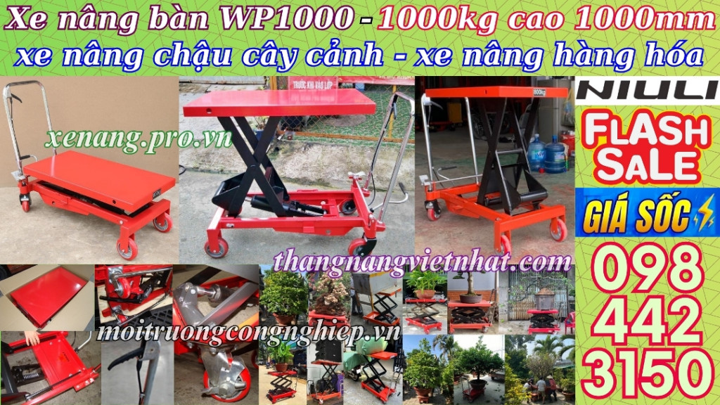 Xe nâng mặt bàn WP1000 - xe nâng bàn WP1000 - bàn nâng tay WP1000 hiệu NIULI - Trung Quốc dùng nâng hạ các loại hàng hóa, sản phẩm, chậu cây cảnh, chậu kiểng máy móc, khuôn mẫu, thùng loa… có khối lượng 1000kg (1 tấn) từ độ cao 1 mét một cách dễ dàng. Giá thành rẻ phù hợp tài chính khách hàng. Đây là giải pháp hoàn hảo giúp tiết kiệm sức lao động, giảm thiểu rủi ro và đảm bảo an toàn cho người sử dụng.