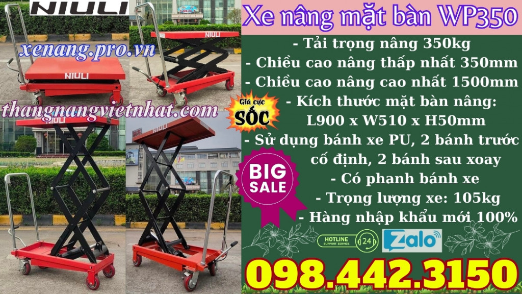 Xe nâng mặt bàn WP350 - xe nâng bàn WP350 - bàn nâng tay WP350 hiệu NIULI - Trung Quốc dùng nâng hạ các loại hàng hóa, sản phẩm, chậu cây cảnh, chậu kiểng máy móc, khuôn mẫu, thùng loa… có khối lượng 350kg từ độ cao 1.5 mét một cách dễ dàng. Giá thành rẻ phù hợp tài chính khách hàng. Đây là giải pháp hoàn hảo giúp tiết kiệm sức lao động, giảm thiểu rủi ro và đảm bảo an toàn cho người sử dụng.