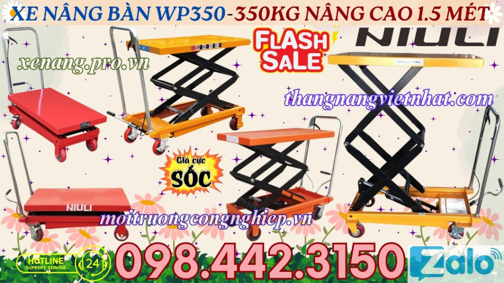 Xe nâng bàn 350kg nâng cao 1.5 mét - xe nâng bàn 350kg nâng cao 1500mm với thiết kế nhỏ gọn kết hợp các bánh xe chịu lực giúp xe vừa nâng vừa di chuyển dễ dàng và cơ chế hoạt động mạnh mẽ có thể nâng tối đa tải trọng 350kg với chiều cao nâng cao nhất 1500mm (1.5 mét) nên xe nâng mặt bàn WP350 là sản phẩm được ưa chuộng và sử dụng rộng rãi trong các nhà vườn, vườn cây cảnh, nhà máy, xưởng sản xuất, kho hàng, bến bãi, siêu thị, cửa hàng...để nâng cây cảnh, chậu cảnh, chậu câu cảnh, hàng hóa, sản phẩm, máy móc, thiết bị, khuôn mẫu, thùng phuy, thùng loa, nguyên vật liệu...