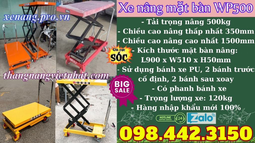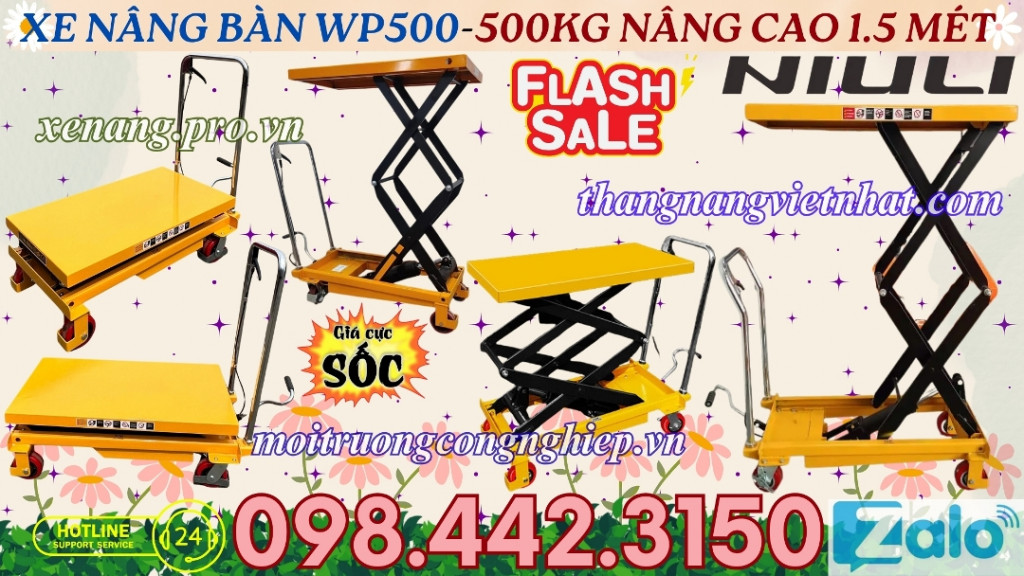 Xe nâng bàn 500kg nâng cao 1.5 mét - xe nâng bàn 500kg nâng cao 1500mm với thiết kế nhỏ gọn kết hợp các bánh xe chịu lực giúp xe vừa nâng vừa di chuyển dễ dàng và cơ chế hoạt động mạnh mẽ có thể nâng tối đa tải trọng 500kg với chiều cao nâng cao nhất 1500mm (1.5 mét) nên xe nâng mặt bàn WP500/1.5M là sản phẩm được ưa chuộng và sử dụng rộng rãi trong các nhà vườn, vườn cây cảnh, nhà máy, xưởng sản xuất, kho hàng, bến bãi, siêu thị, cửa hàng...để nâng cây cảnh, chậu cảnh, chậu câu cảnh, hàng hóa, sản phẩm, máy móc, thiết bị, khuôn mẫu, thùng phuy, thùng loa, nguyên vật liệu...