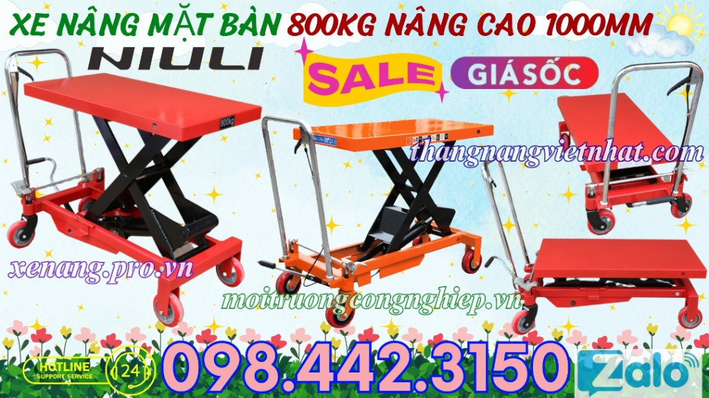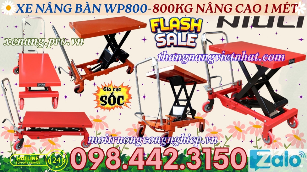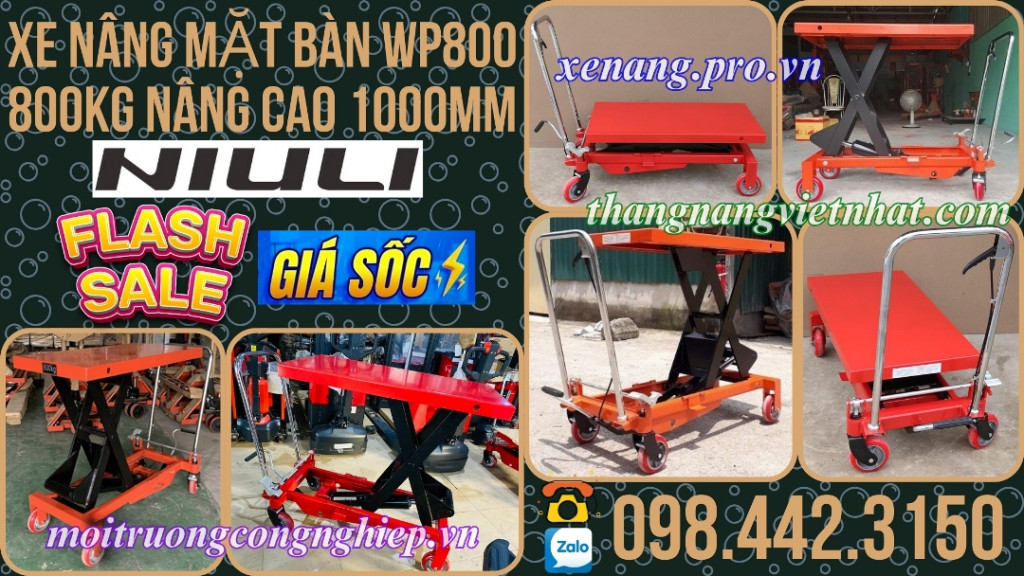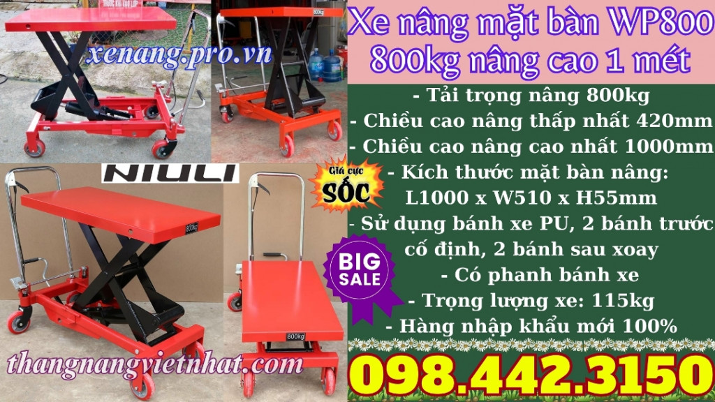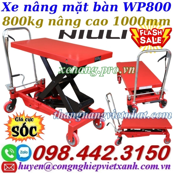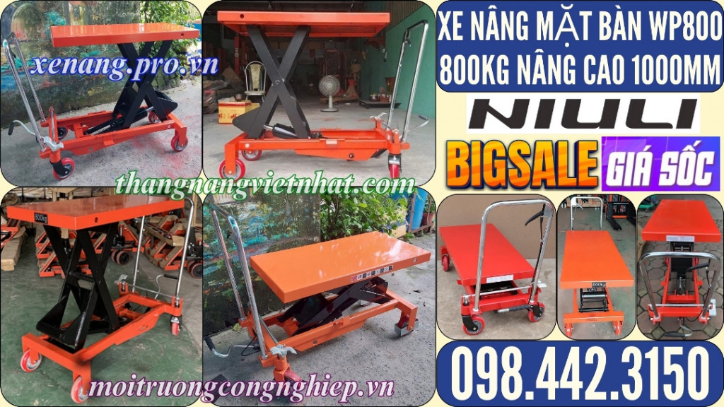 Xe nâng mặt bàn WP800 - xe nâng bàn WP800 - bàn nâng tay WP800 hiệu NIULI - Trung Quốc dùng nâng hạ các loại hàng hóa, sản phẩm, chậu cây cảnh, chậu kiểng máy móc, khuôn mẫu, thùng loa… có khối lượng 800kg từ độ cao 1 mét một cách dễ dàng. Giá thành rẻ phù hợp tài chính khách hàng. Đây là giải pháp hoàn hảo giúp tiết kiệm sức lao động, giảm thiểu rủi ro và đảm bảo an toàn cho người sử dụng.