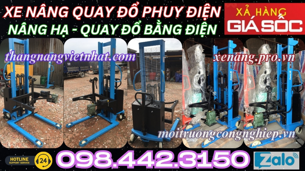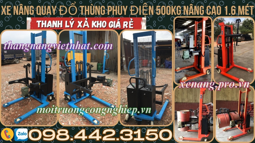 - Xe nâng quay đổ phuy điện cao 1.6 mét tải trọng 500kg được dủng để nâng hạ và quay đổ thùng phuy sắt hoặc thùng phuy nhựa có dung tích 200L/ 220L, tải trong 500kg lên độ cao 1600mm