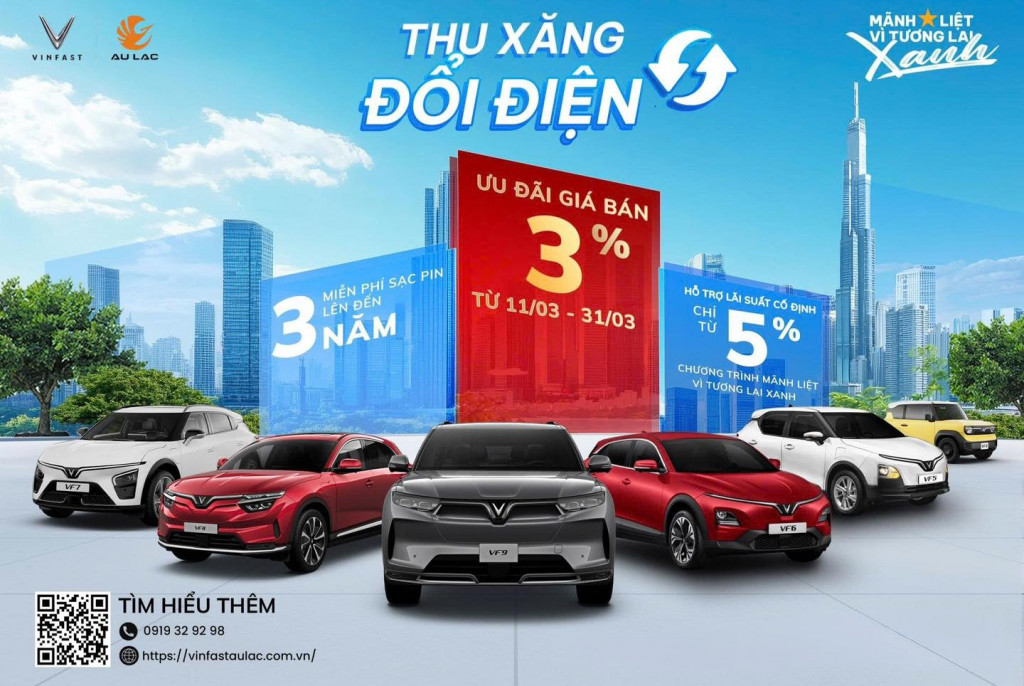 Chương trình “Thu xăng - Đổi điện” đặc biệt sẽ được VinFast Âu Lạc triển khai song song và áp dụng cộng dồn với các chính sách ưu đãi hấp dẫn khác tại từng thị trường. Các chương trình ưu đãi khác được áp dụng song song bao gồm: