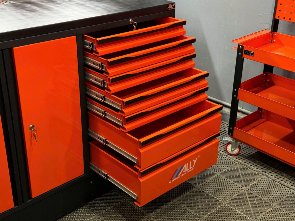 Hệ tủ thao tác ALLY QT-HT27 được thiết kế đồng bộ gồm 2 tủ đồ nghề 7 ngăn, 1 tủ 2 cánh lớn, và mặt bàn thao tác gỗ ép cao su dày 36mm.