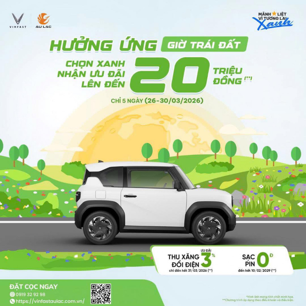 Giờ Trái Đất không chỉ là một khoảnh khắc tắt đèn, mà còn là thời điểm để bắt đầu những thay đổi tích cực cho tương lai. Đồng hành cùng hành trình sống xanh, VinFast mang đến ưu đãi hấp dẫn dành cho khách hàng đặt cọc xe trong thời gian diễn ra chương trình.