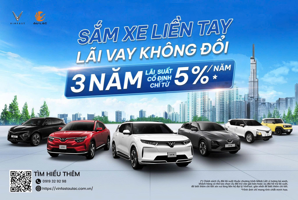 (*) Ưu đãi hỗ trợ lãi suất thuộc chương trình Mãnh Liệt Vì Tương Lai Xanh, khách hàng được lựa chọn Ưu đãi trừ vào giá bán xe hoặc Ưu đãi hỗ trợ lãi suất, để biết thêm chi tiết xin vui lòng liên hệ hotline 0919 32 92 98 hoặc đại lý VinFast Âu Lạc gần nhất để được tư vấn.