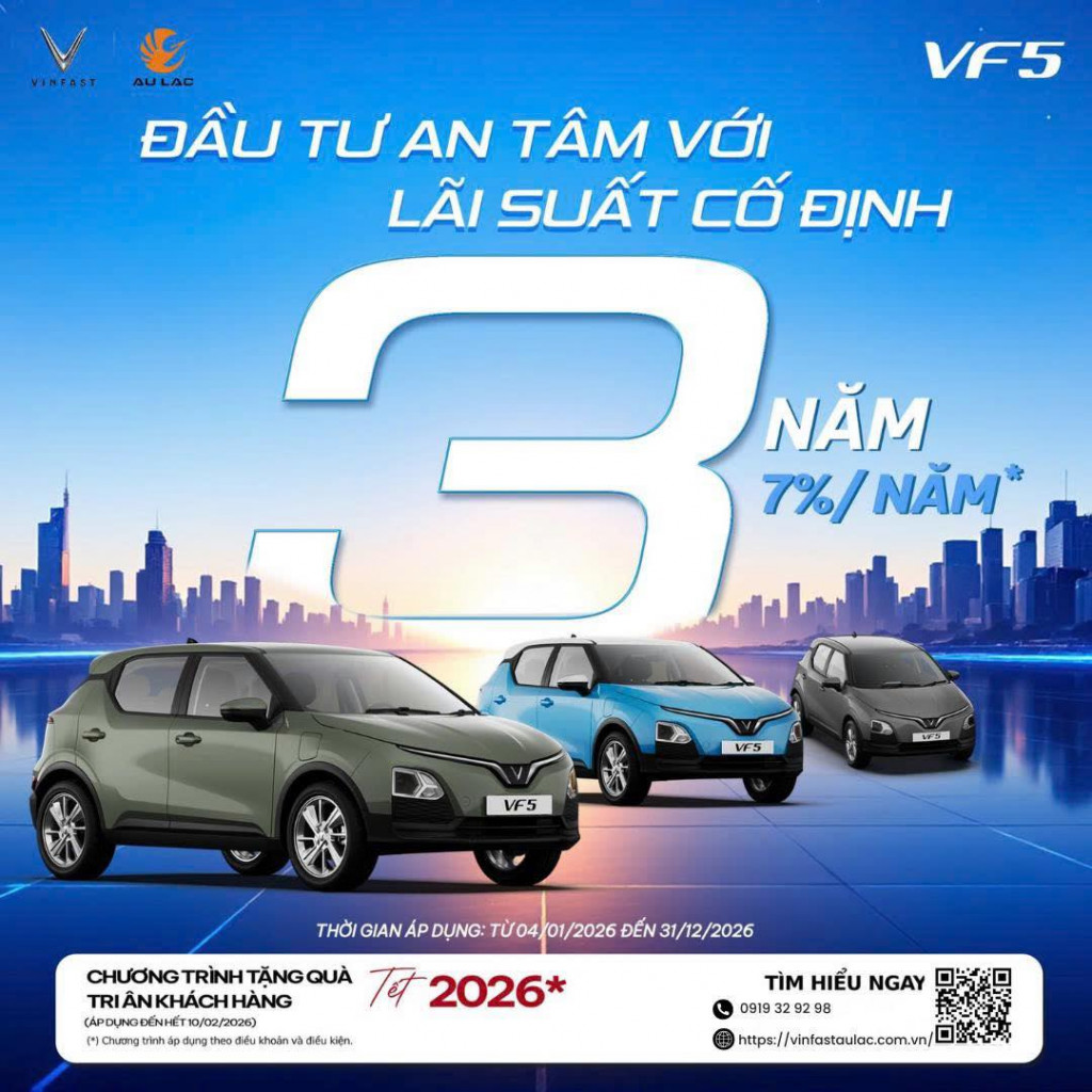 Với chính sách hỗ trợ lãi suất cố định 7%/năm trong 3 năm đầu*, việc sở hữu VF 5 – mẫu A-SUV điện nhỏ gọn dành cho đô thị – nay trở nên dễ tiếp cận và an tâm hơn nhờ các ưu đãi hấp dẫn: