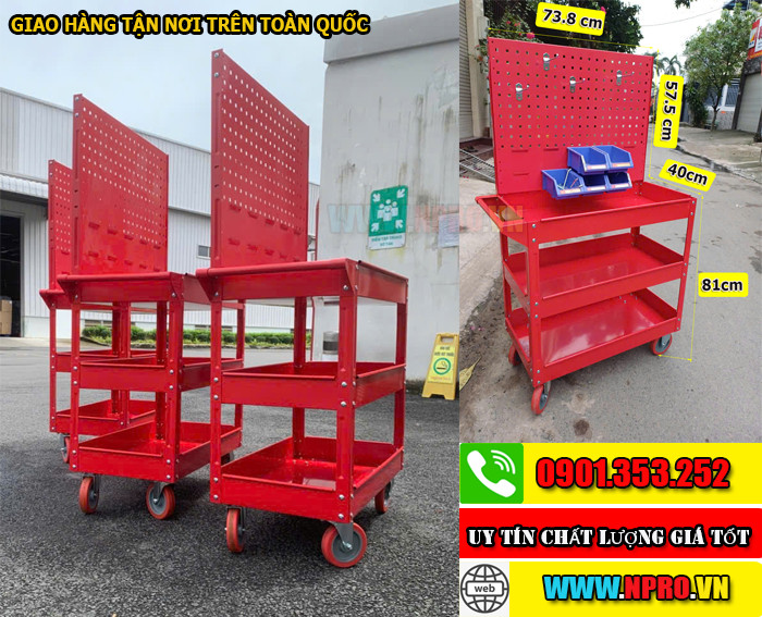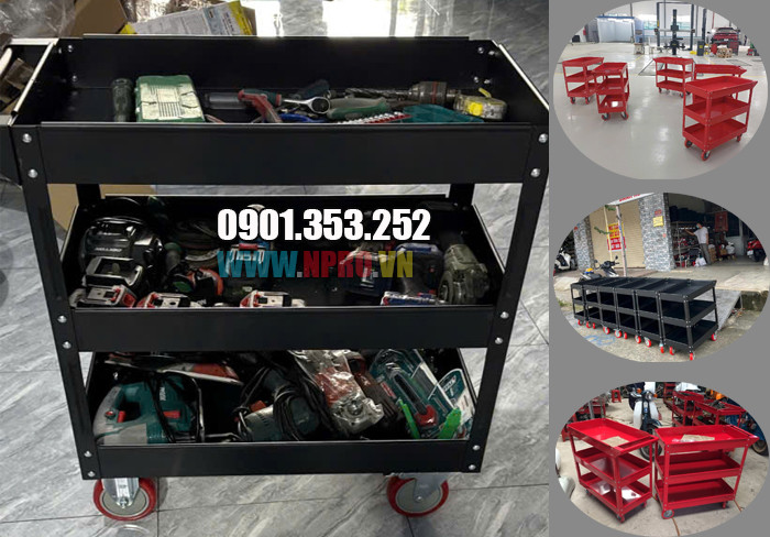 Đó là loại xe đẩy có 3 tầng chứa đồ, khung thép chắc chắn, bánh xe linh hoạt, được dùng phổ biến trong: Gara ô tô, tiệm sửa xe máy, xưởng cơ khí, xưởng bảo trì, lắp ráp hay tại các nhà xưởng sản xuất. Thiết bị vừa là trợ lý, vừa là “giỏ đồ nghề di động” giúp thao tác nhanh và giảm thất lạc dụng cụ.