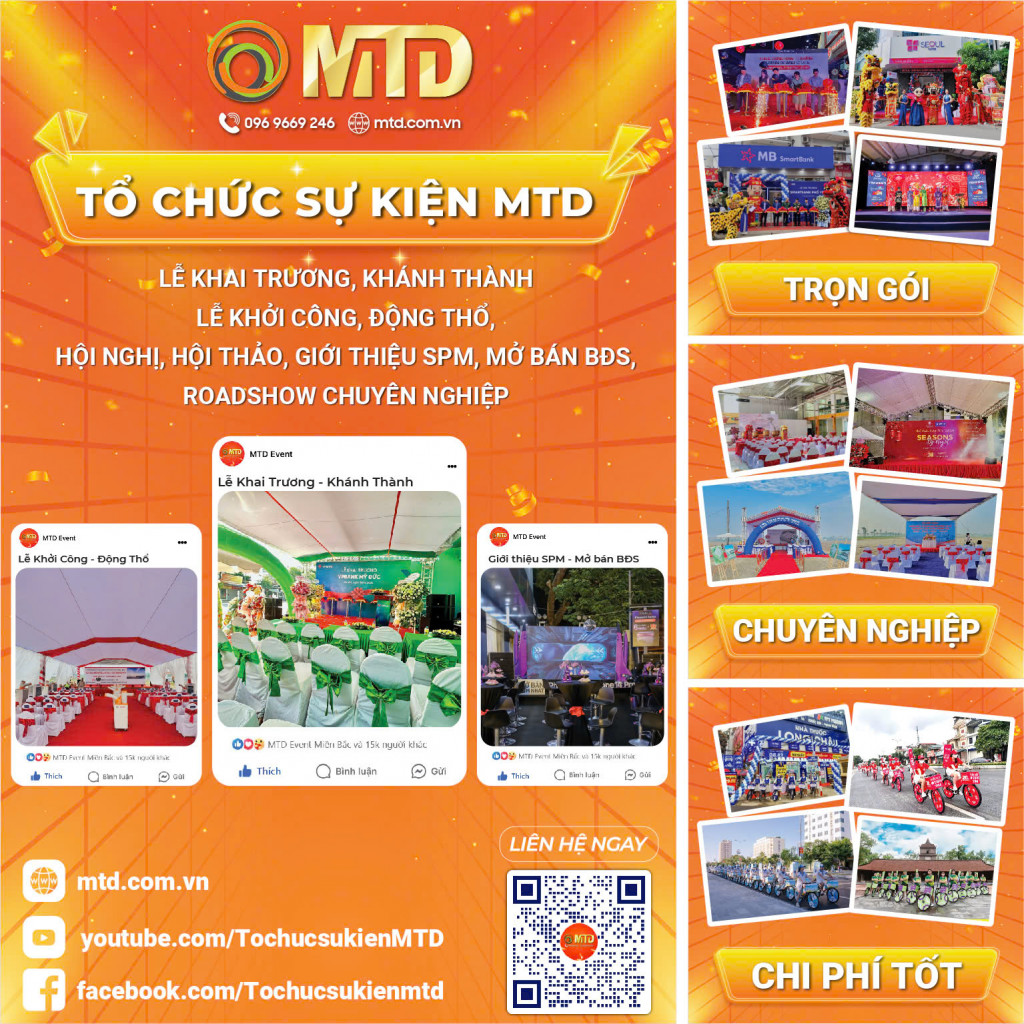 MTD EVENT là công ty tổ chức sự kiện chuyên nghiệp, mang đến những trải nghiệm ấn tượng và sáng tạo cho khách hàng. Với đội ngũ giàu kinh nghiệm, MTD EVENT cung cấp đa dạng dịch vụ như tổ chức hội nghị, tiệc khai trương, sự kiện doanh nghiệp và lễ kỷ niệm. Công ty luôn chú trọng từ ý tưởng, thiết kế đến khâu vận hành nhằm đảm bảo mỗi sự kiện đều diễn ra thành công và khác biệt. Nếu bạn đang tìm kiếm một đơn vị tổ chức sự kiện uy tín, MTD EVENT chính là lựa chọn đáng tin cậy để biến mọi ý tưởng thành hiện thực.