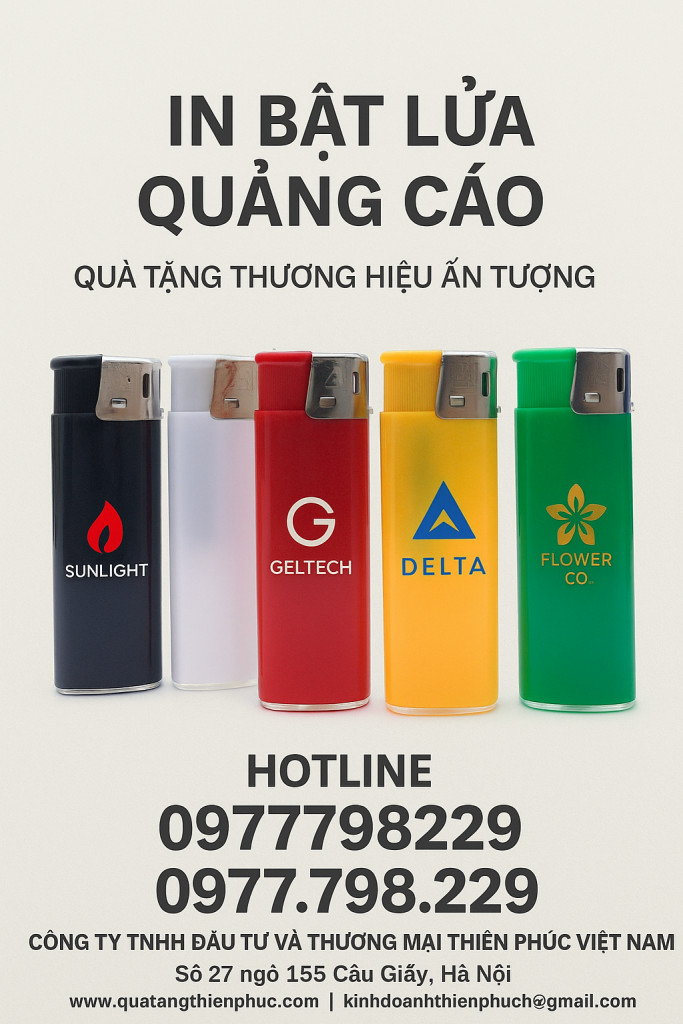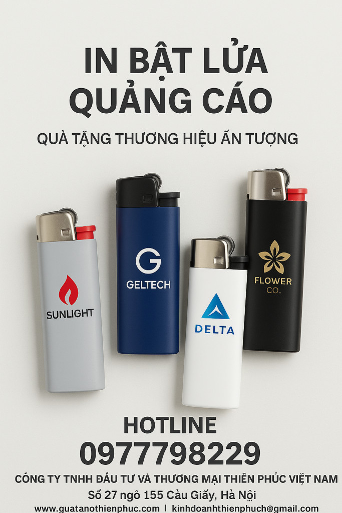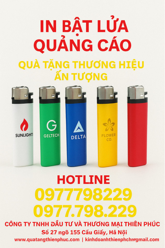 Bạn cần quà tặng doanh nghiệp ấn tượng hay một món đồ cá nhân độc bản? Chúng tôi mang đến giải pháp in ấn chuyên nghiệp trên mọi dòng bật lửa : bật lửa nhựa, bật lửa khò, bật lửa đá, bật lửa điện IC).